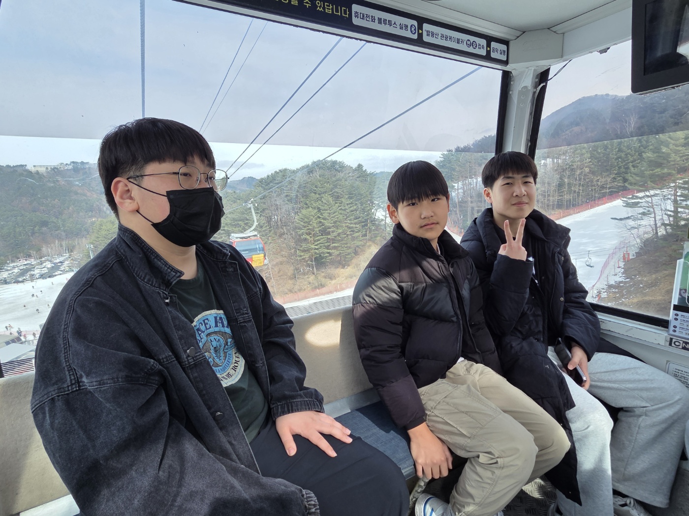 해발 1,458m 높이의 발왕산 정상까지 왕복 7.4km를 이동하는 케이블카는 약 40분 정도 소요되는데, 창밖으로 펼쳐지는 겨울 풍경은 그야말로 장관이었습니다. 눈으로 덮인 산과 케이블카 아래로 펼쳐진 스키장의 모습은 아이들의 시선을 사로잡기에 충분했습니다.
