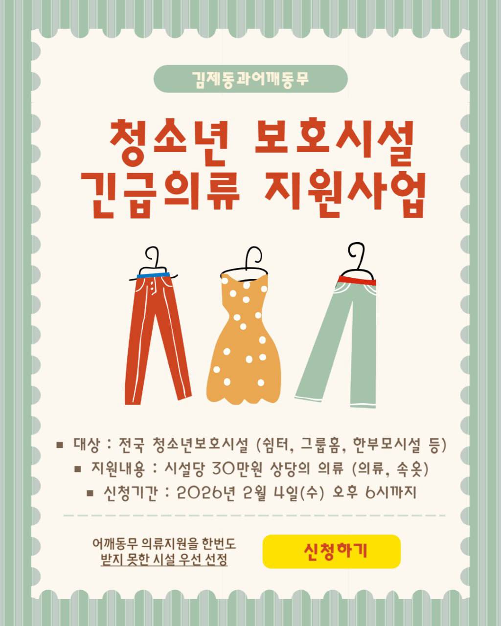 '김제동의 어깨동무'에서 진행한 의복지원 사업에 선정되어 아이들에게 꼭 필요한 선물이 전해졌기 때문입니다.