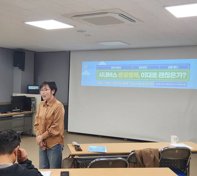 마산YMCA 시민논단에서는 「준공영제를 넘어서는 시간」을 주제로 공공교통의 현재와 방향을 함께 고민하는 자리를 마련했습니다. 이번 논단은 공공교통네트워크 김상철 정책센터장의 발제로 진행되었으며, 시내버스 준공영제의 구조적 문제와 대안을 중심으로 깊이 있는 이야기를 나누었습니다.