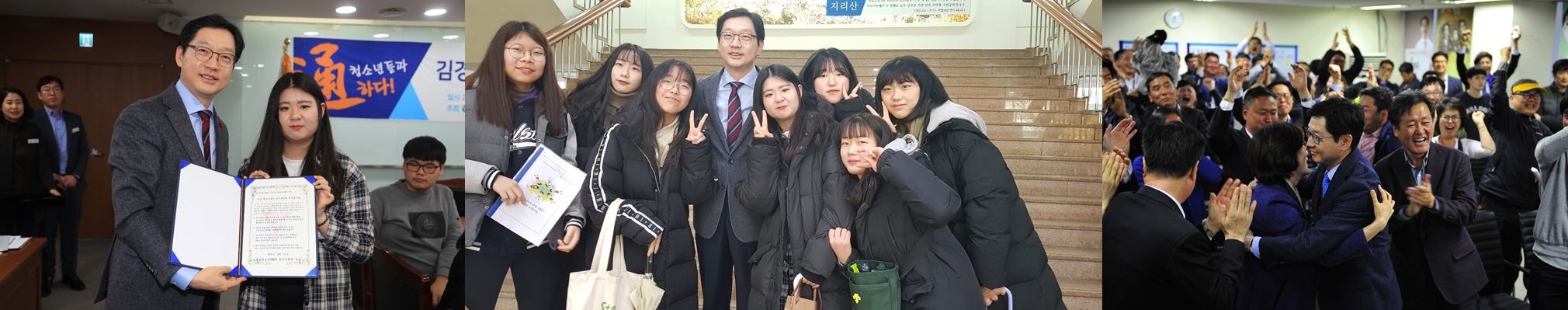당선 이후 예기치 못한 어려움을 격고 있습니다만, "완전히 새로운 경남"을 만들기 위해 노력하고 계십니다. 김경수 도지사는 경남지역 청소년들이 뽑은 '경남지사'에도 당선이 되었습니다. (18세 참정권 운동을 하는 청소년 대표들을 직접 만난 첫 번째 도지사입니다.)