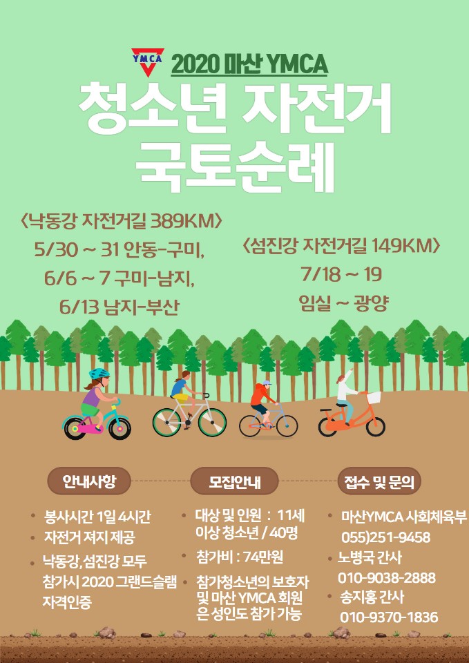 코로나19로 인해 올해 자전거 국토순례는 지역별로 진행하게 되었으며, 마산 YMCA에서는 자체 진행으로 국토순례를 기다렸던 청소년들, 그랜드슬램을 위해 4년 동안 준비했던 청소년들과 만나려고 합니다.