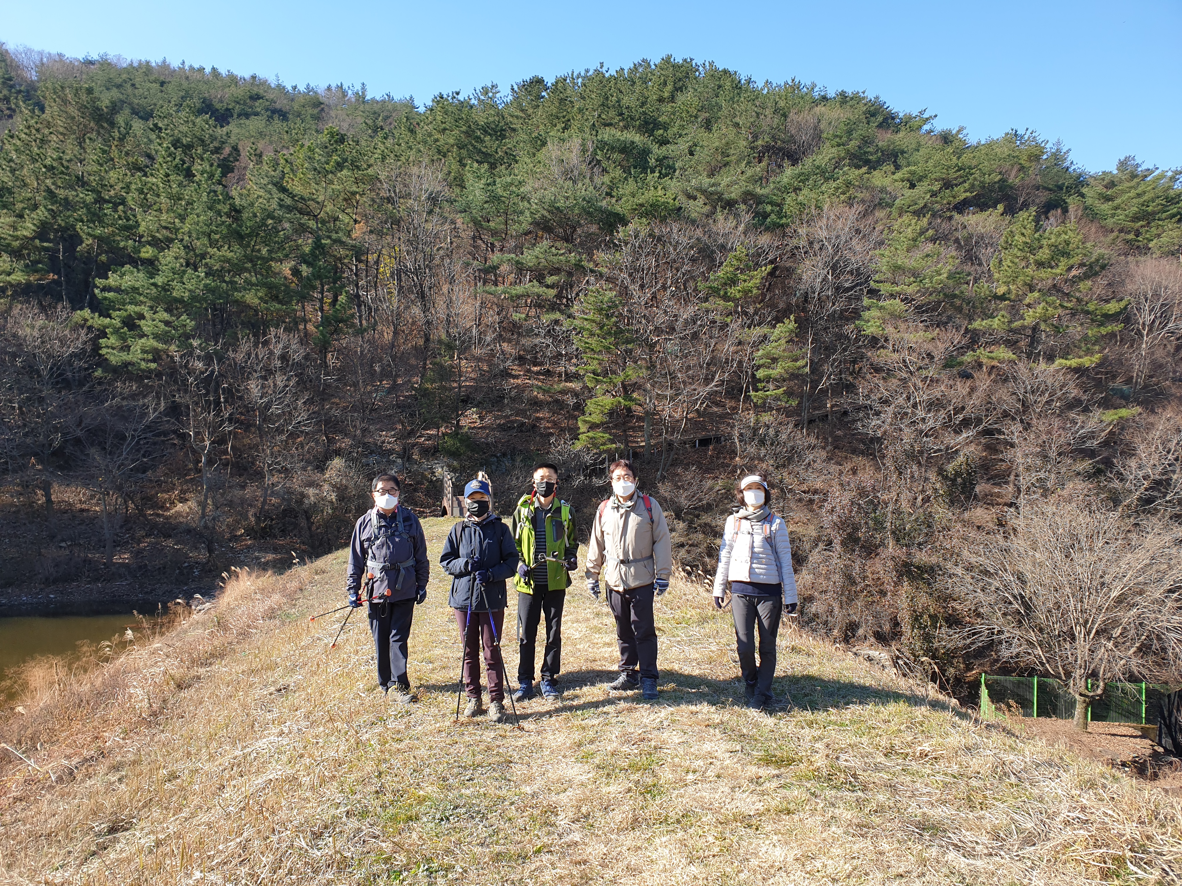 기온이 오르고 운동으로 몸도 따뜻해지며 산행에 탄력이 붙었습니다. 이미 <걷는사람들>을 통해 이 길을 밟으셨던 김형준 이사장님, 여름의 이 길을 만끽하신 김정하 이경수 위원님이 이끄셨고, 조정순 회장님은 한적하고 너무 좋다며 이 길을 반드시 다시 와야겠다고 감탄하셨습니다. 5-6년 만에 산에 오른 이종호 이사님도 흡족해 하셨습니다. 1.5km 정도를 걸으니 내서 안성마을 소류지에 도착했고 멋진 포즈로 한 컷 찍었습니다.