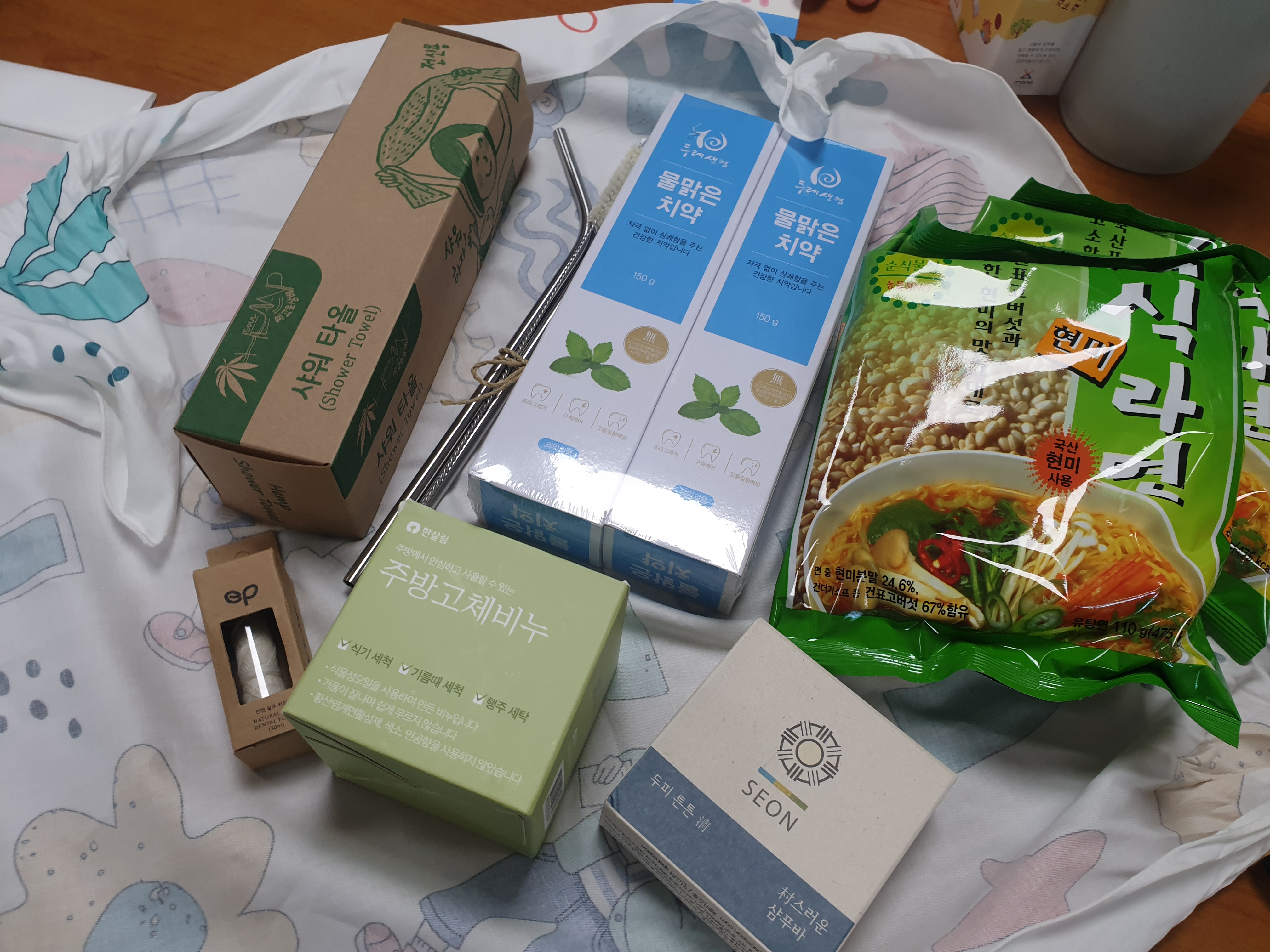 필환경인으로 살아가기 위한 기본 키트가 배송된 느낌! 다들 느끼셨나봐요. 유리용기에 담긴 생분해 천연 치실부터, 스테인리스 빨대, 샴푸바, 삼베타월, 주방고체비누, 치약, 채식라면, 사코슈백 등등 푸짐하게 담겨온 키트에 모두 감동하셨다는 이야기 전해들었습니다. 이 중 의외의? 엄청난 인기는 주방고체비누였습니다. 별 기대 안하고 썼는데 손이 뻑뻑해지지도 않고 거품도 잘나서 세제를 대체할 최고의 상품으로 모두 입을 모아 주셨답니다. 환경을 생각하는 소비자 어렵거나 멀리있는 것이 아니라는 것을 보여준 2번키트였습니다.