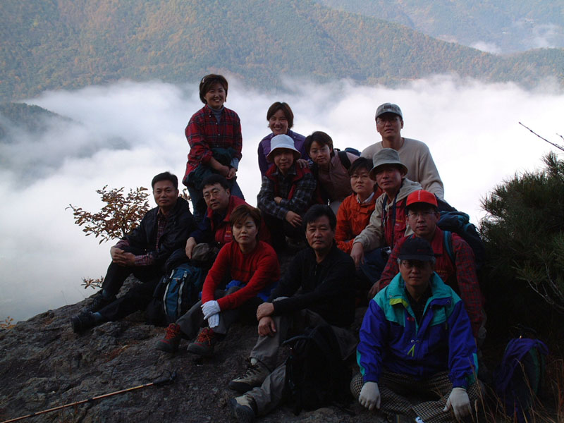 제 9차 산행(2001년 11월 11일) 김해무척산 - (앞줄) 차윤재 김형준 조정순 허정도 이용규 (뒷줄) 김경년 OOO 서정애 조정림 황혜정 김인성 박영민 (맨뒷줄) 이윤기