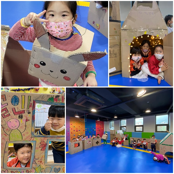 반마다 만든 놀이터는 정말 훌륭했습니다. 교실 벽에 걸려있던 꼬마전구를 이용해 감성텐트를 만들기도 하고, 또 집으로 만들어 앞 뒤 문을 달아 드나들 수 있게 만들기도했습니다. 농구대를 만든 반도 있었습니다. 공은 말랑말랑한 걸 이용해야 된다며 아이들 이야기가 많