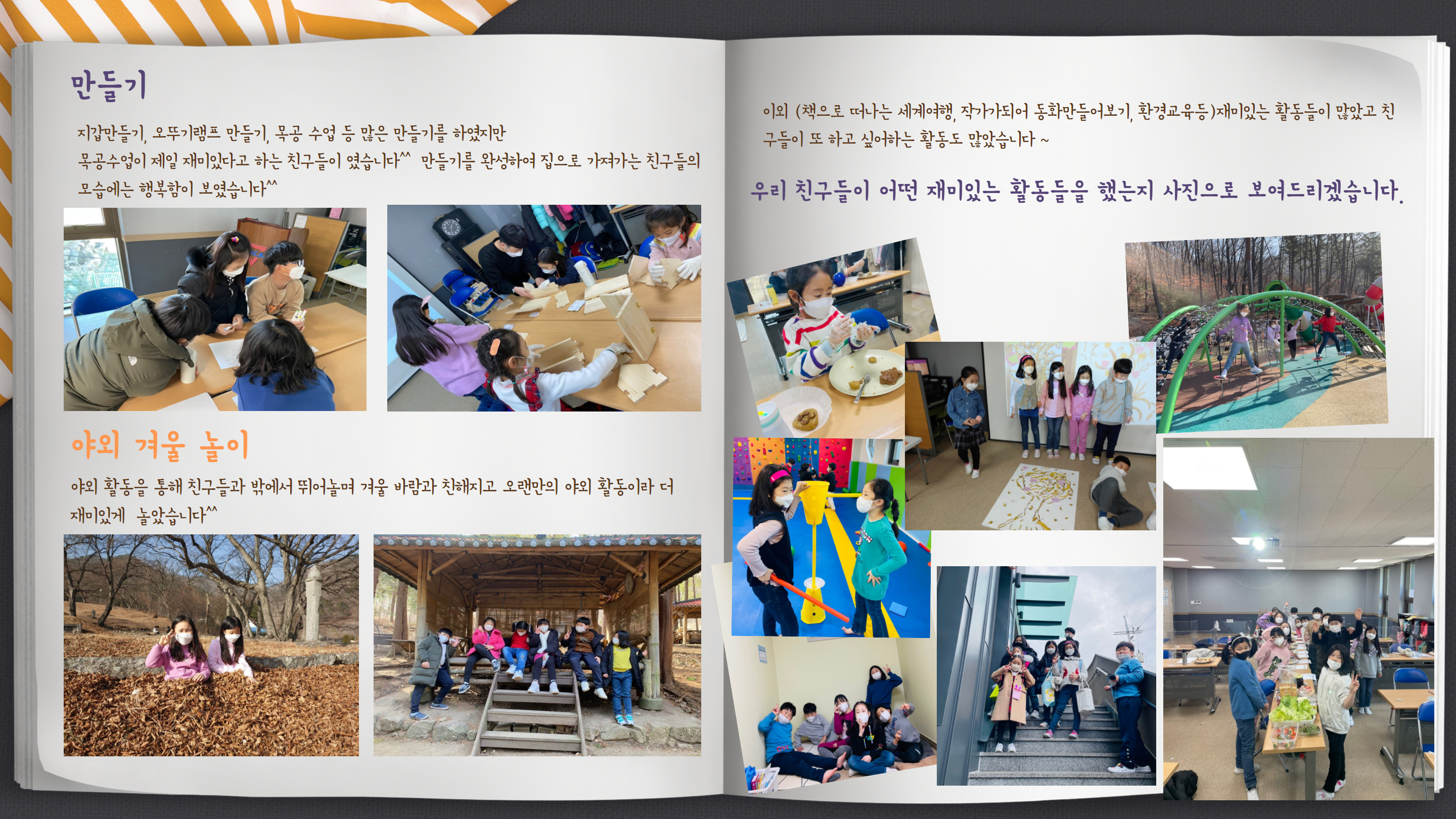 안에서만 하는 활동들이 많지만 지루하지 않도록 푸드테라피, 야외 활동 등 많은 재미있는 활동들로