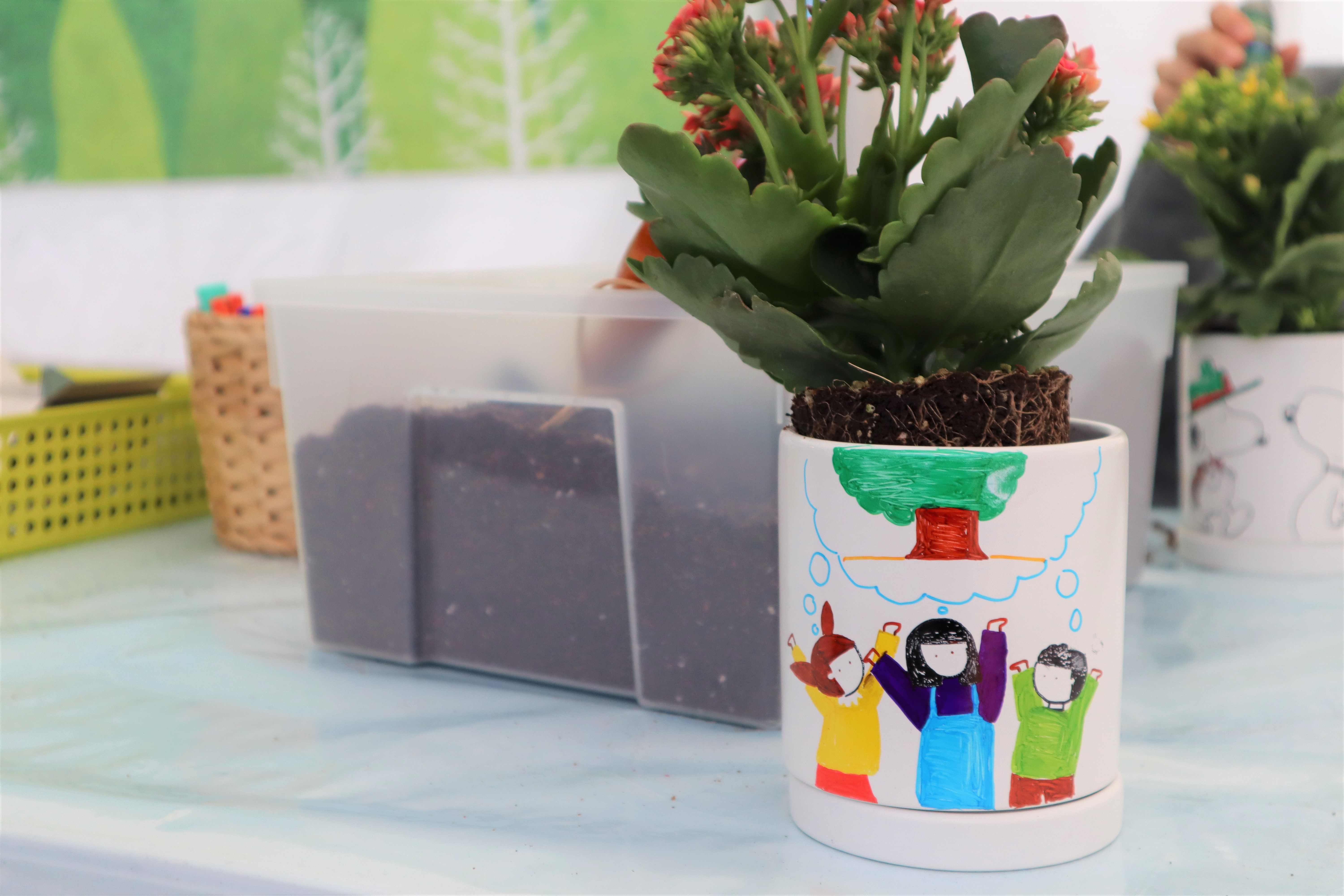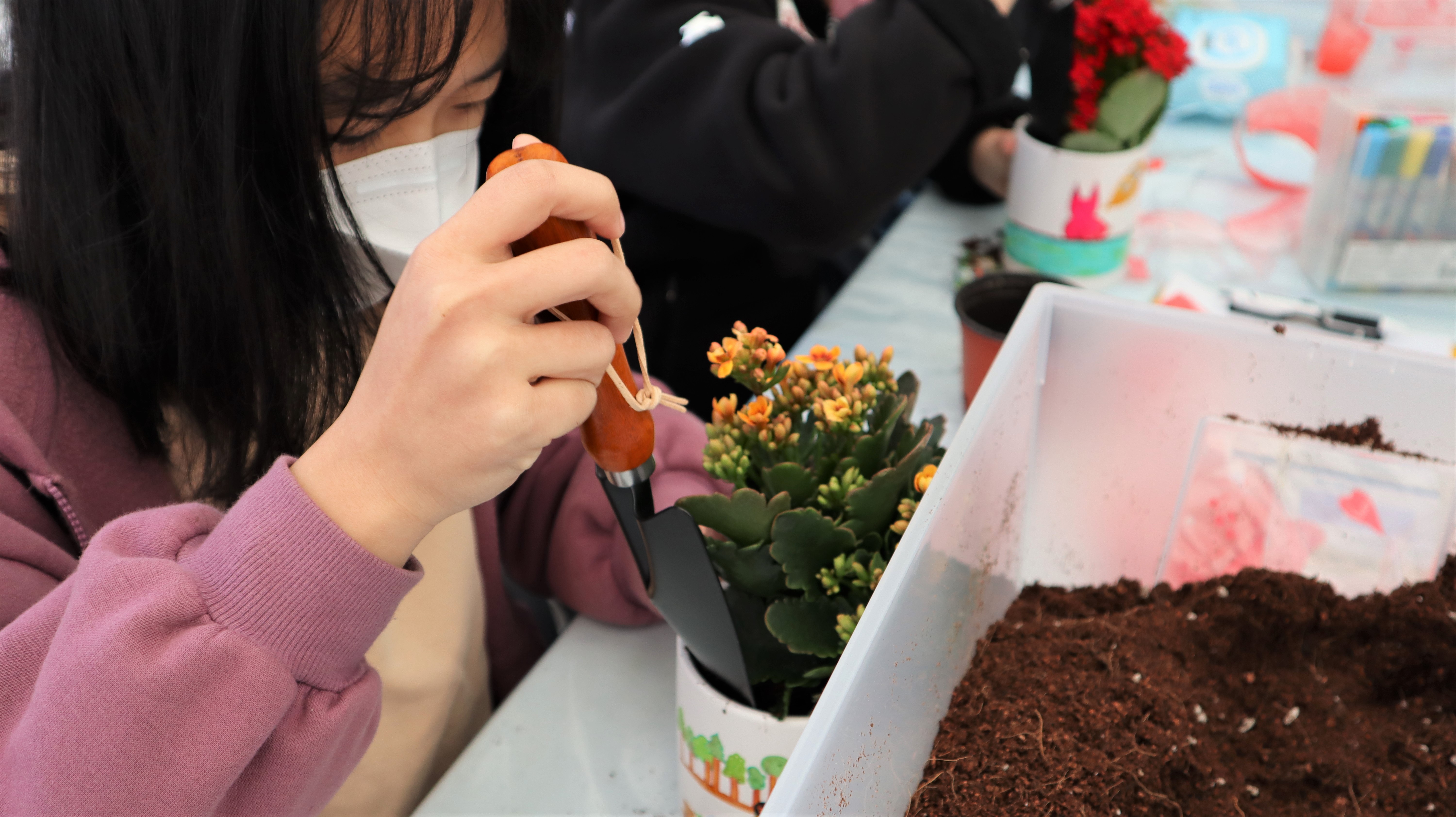 청소년들이 화분에 긍정적! 희망적! 문구를 적어서 모종을 심어주면