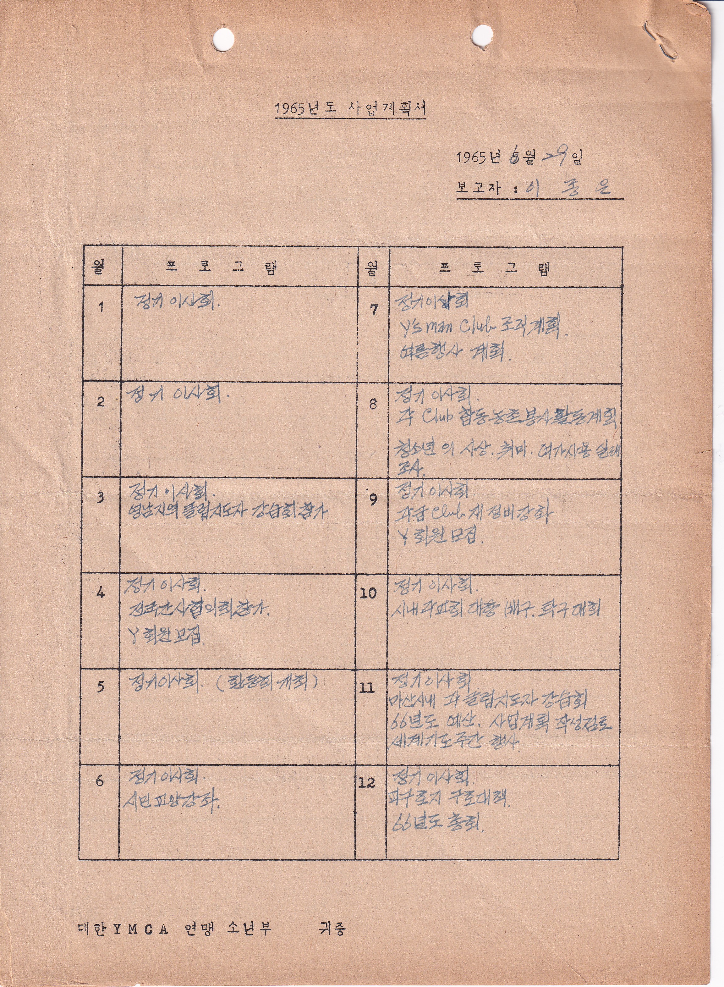 이 공문의 두 번째 페이지에는 1965년 연간 사업계획이 월별로 정리되어 있습니다. 당시 마산YMCA는 매월 정기이사회를 개최하였고, 4월과 9월에 두 차례 회원 모집 기간이 있었습니다.