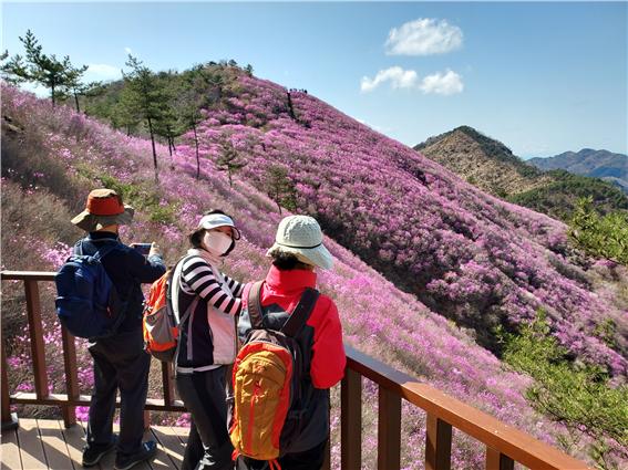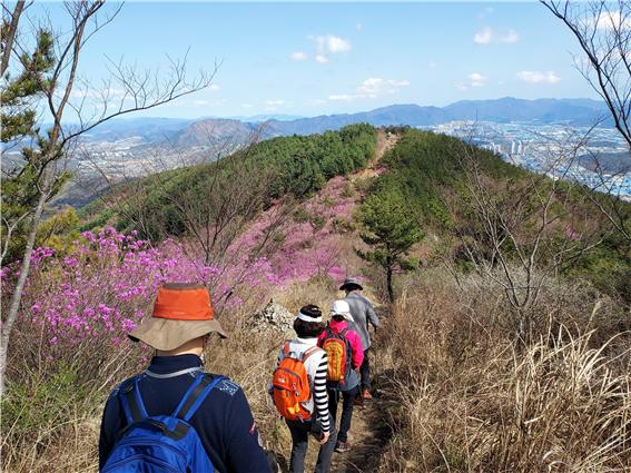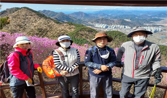 이제부턴 정상으로 가는 가파른 산행, 하지만 올라갈수록 북면과 동읍 일대가 조망되고 진달래 군락이 펼쳐지는 장관이 펼쳐지기 시작했습니다. 박수연 이사님이 준비해 오신 키위주스가 없었다면 결코 못 올라갈 것이었습니다. 두 사람이 지나가기에는 다소 좁은 데크 계단은 개선이 필요해 보였습니다. 마침내 정상인 용지봉. 많은 사람들이 정상 표지석에서 기념사진을 남기려고 줄을 서 있었고 저희도 한 컷 했습니다. 용지봉에서 바라본 전경은 말로 표현할 수 없을 만큼 대단했는데, 너무 시야가 좋아서 김해 불모산, 마창대교, 낙동강은 물론 멀리 거제도와 거가대표도 볼 수 있었습니다. 이런 장면은 평생 남을 것 같았습니다. 이젠 하산길, 그런데 정작 최고의 진달래 군락은 천주산 후면, 그러니까 북면 쪽에 모습을 드러냈습니다. 많은 분들이 황홀한 장면을 남기려고 전망대는 붐빌 정도였습니다. 올라갈 때는 다소 힘들지만 내려갈 때는 진달래를 만끽하면 가는 산행은 산행대장이 아니면 선택하지 못했을 것이라는 칭찬이 이어졌습니다.