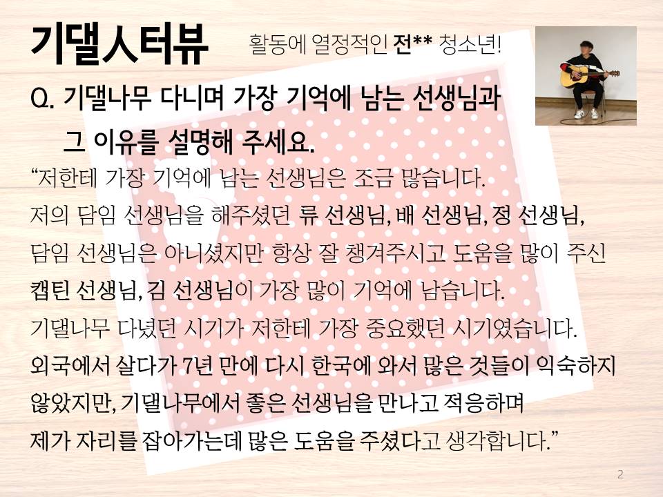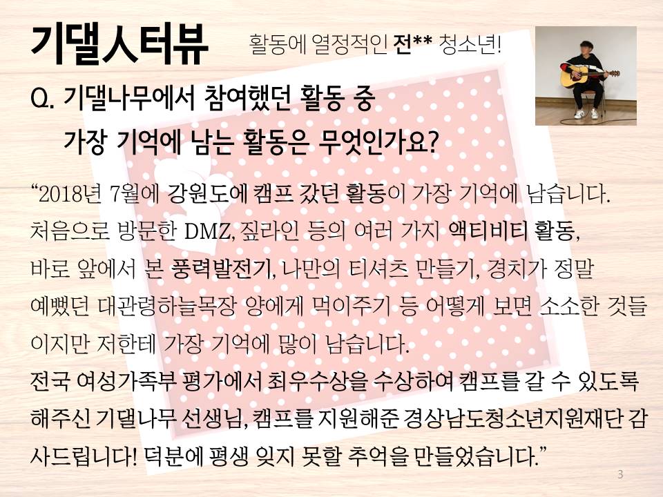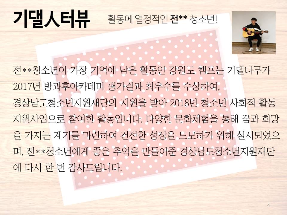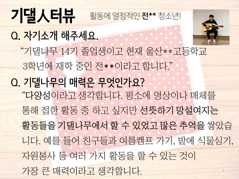 전**청소년은 기댈나무에서 다양한 활동에 참여하고 소중한 추억을 쌓으며 가장 행복한 시기를 보내고 졸업했습니다. 열정 청소년 전** 청소년의 인터뷰는 사진으로 만날 수 있습니다.