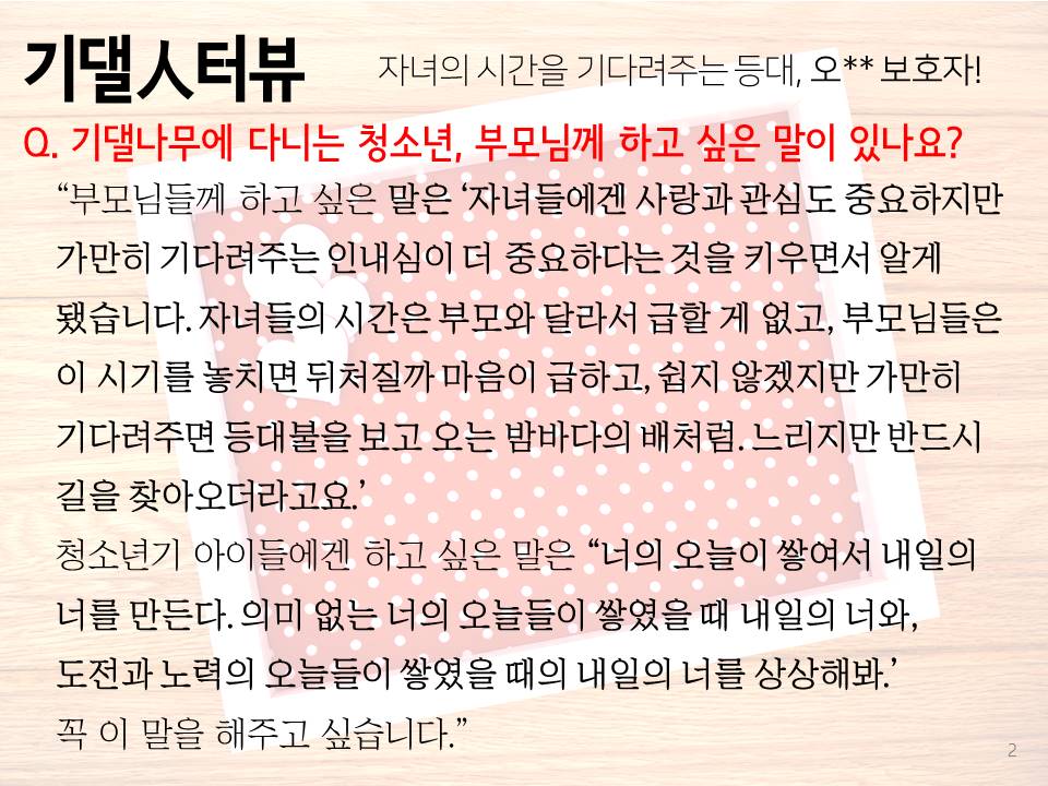 이번 주에 소개할 인터뷰 대상자는 오** 보호자입니다. 자녀의 시간을 기다려주는 등대 같은 오** 보호자!