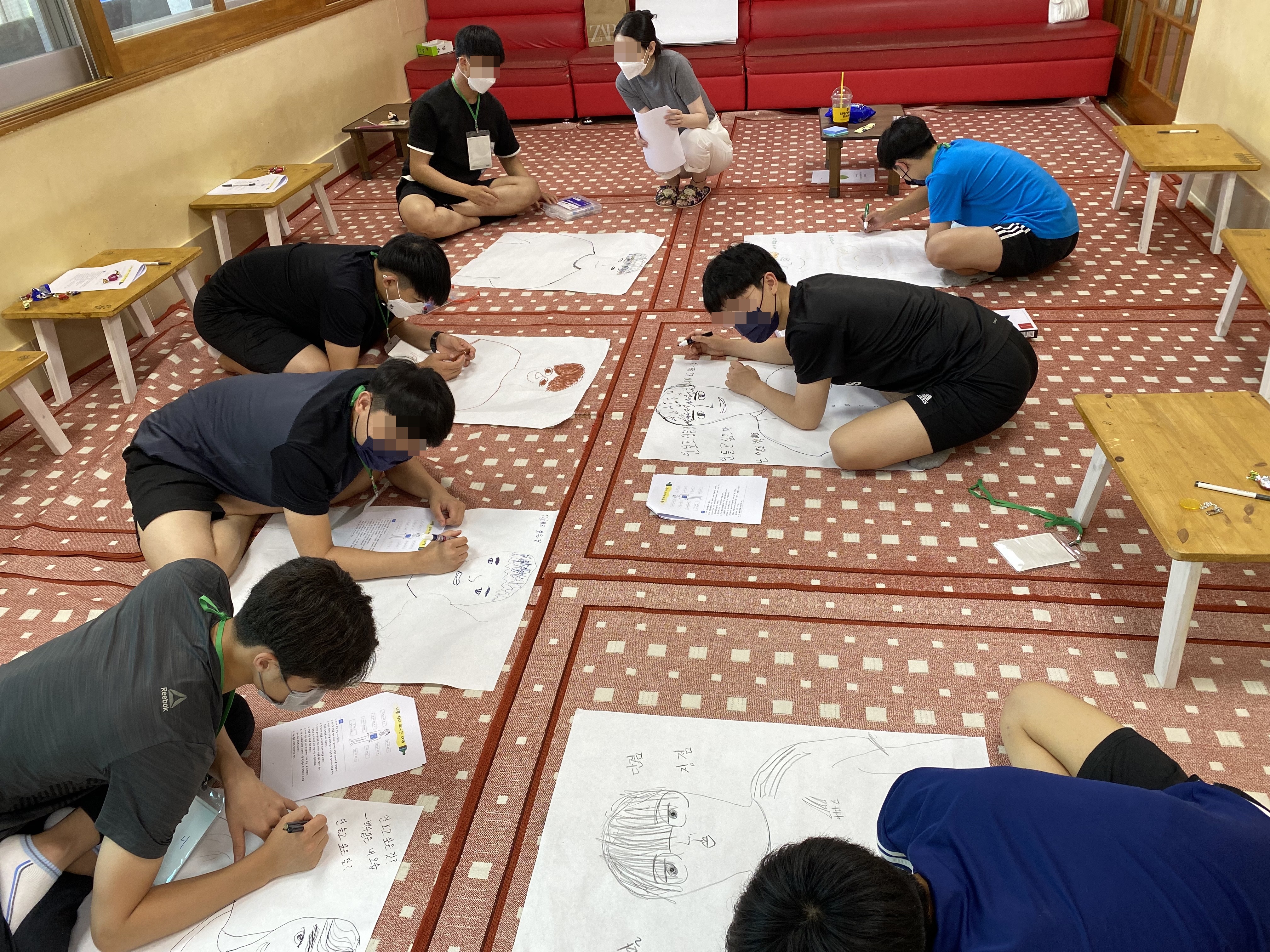 여러 활동 중 청소년들에게 가장 인기가 많았던 '나를 찾아 떠나는 여행'의 활동으로써 자신이 누구이며, 자신이 어떤 감정을 가졌고 왜 그렇게 행동하는가? 등 청소년들이 자신에 대해 제대로 이해하는 능력을 갖출 수 있도록 재미있는 그림 활동을 통해 이해력을 높였습니다.