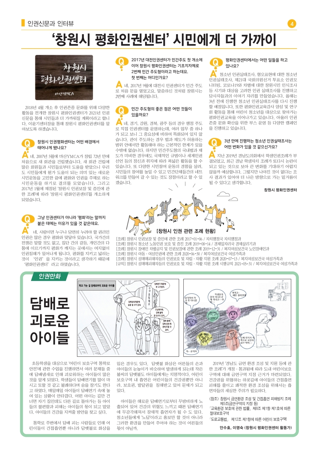 코로나19 사회적 거리두기와 대면소통이 여전히 어려운 상황입니다. 센터에서도 꾸준히 진행하던 캠페인, 찾아가는 평화인권교육 등이 많이 위축되었습니다. 그래도 코로나19와 함께 소통할 수 있는 방법으로 인권신문 발간과 온라인 활동을 활성화하려고 합니다.