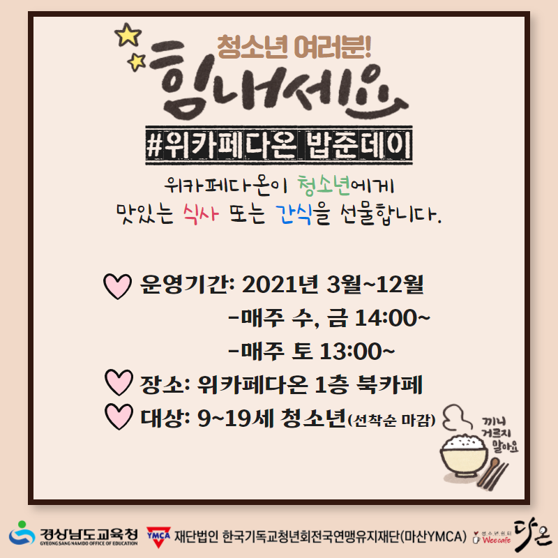 '밥' 만큼 한국인의 정서를 잘 담고 있는 단어가 또 있을까요? 인사할 때는 "밥은 먹었어?", 다음 만남을 약속할 때는 "다음에 밥 한 번 먹자!", 감사한 마음을 전할 때 "고마워. 내가 밥 한 번 살게.", 부탁할 때 "이거 되면 내가 밥 한 번 거하게 살게.", 누군가를 걱정할 때도 "밥은 먹고살겠어?", 심지어 누군가의 잘못을 지적할 때도 "너 그러다 콩밥 먹어." 등등. 우리는 밥으로 참으로 다양한 마음을 전하며 살아갑니다. 일상 속에서 힘들고 지칠 때, 백 마디 말보다 맛있는 밥 한 끼가 더 와닿는 날들이 있죠? 위카페 다온은 밥이 가진 위로와 응원의 힘을 알기에, '밥준데이'로 청소년들의 오늘을 응원합니다.