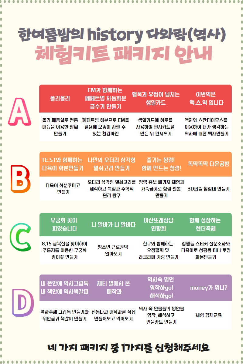 A,B,C,D 4개의 패키지 중 1가지를 골라 신청해주시면 되는데요!