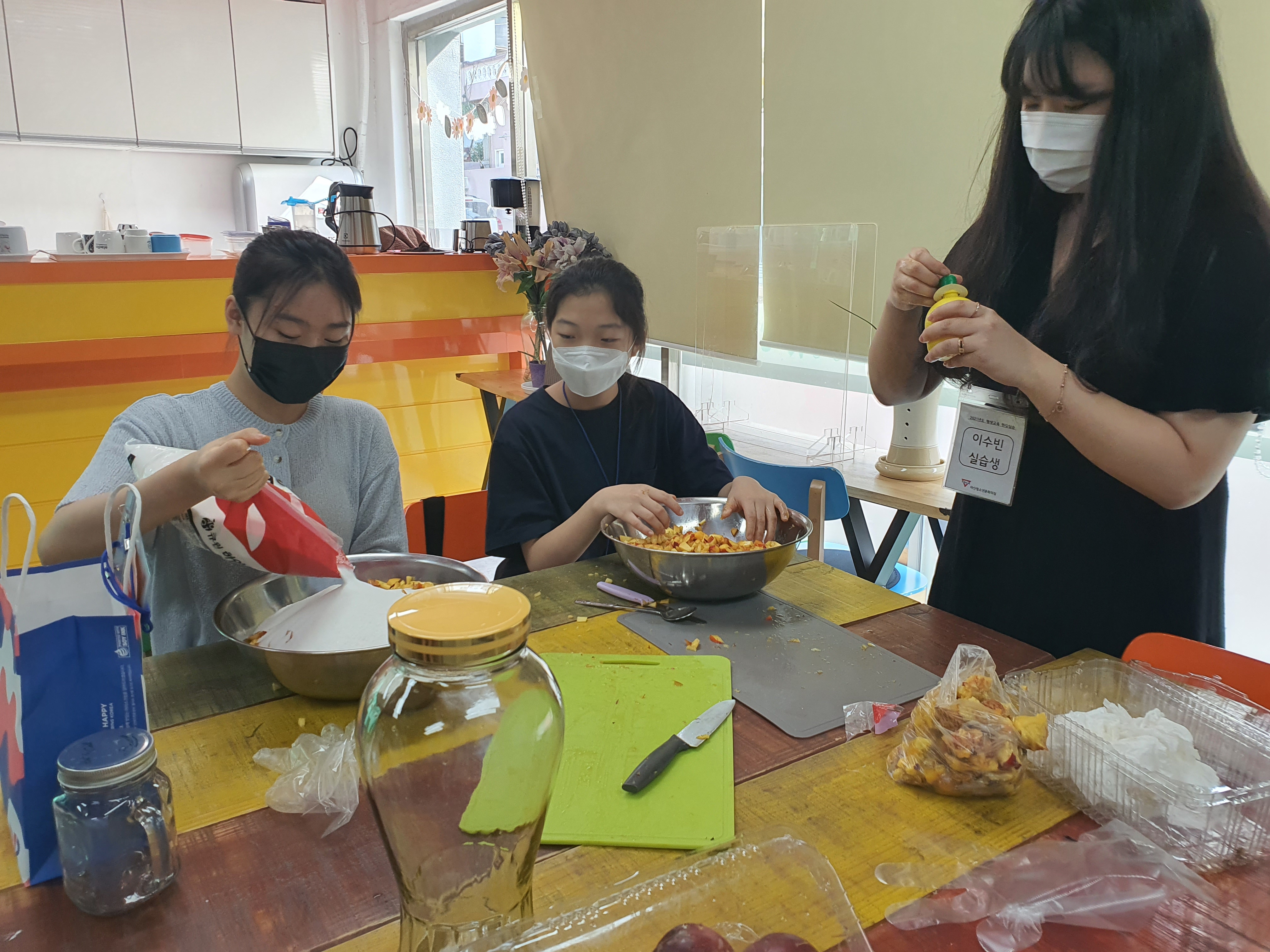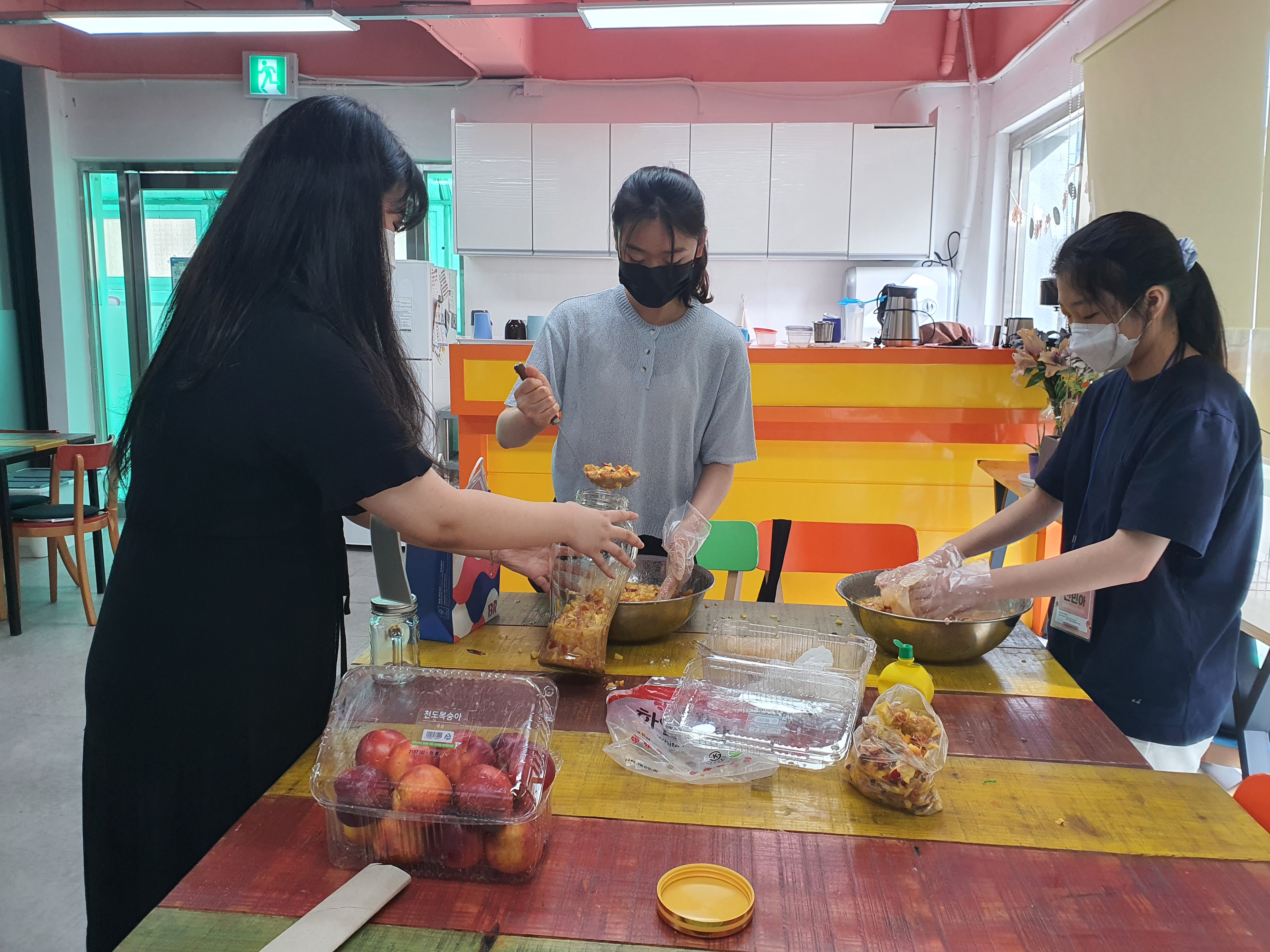 자르는 과정에서 칼질을 처음 해보는 청소년들이 있어 선생님들의 도움으로 안전하게 활동을 이어나갔습니다.