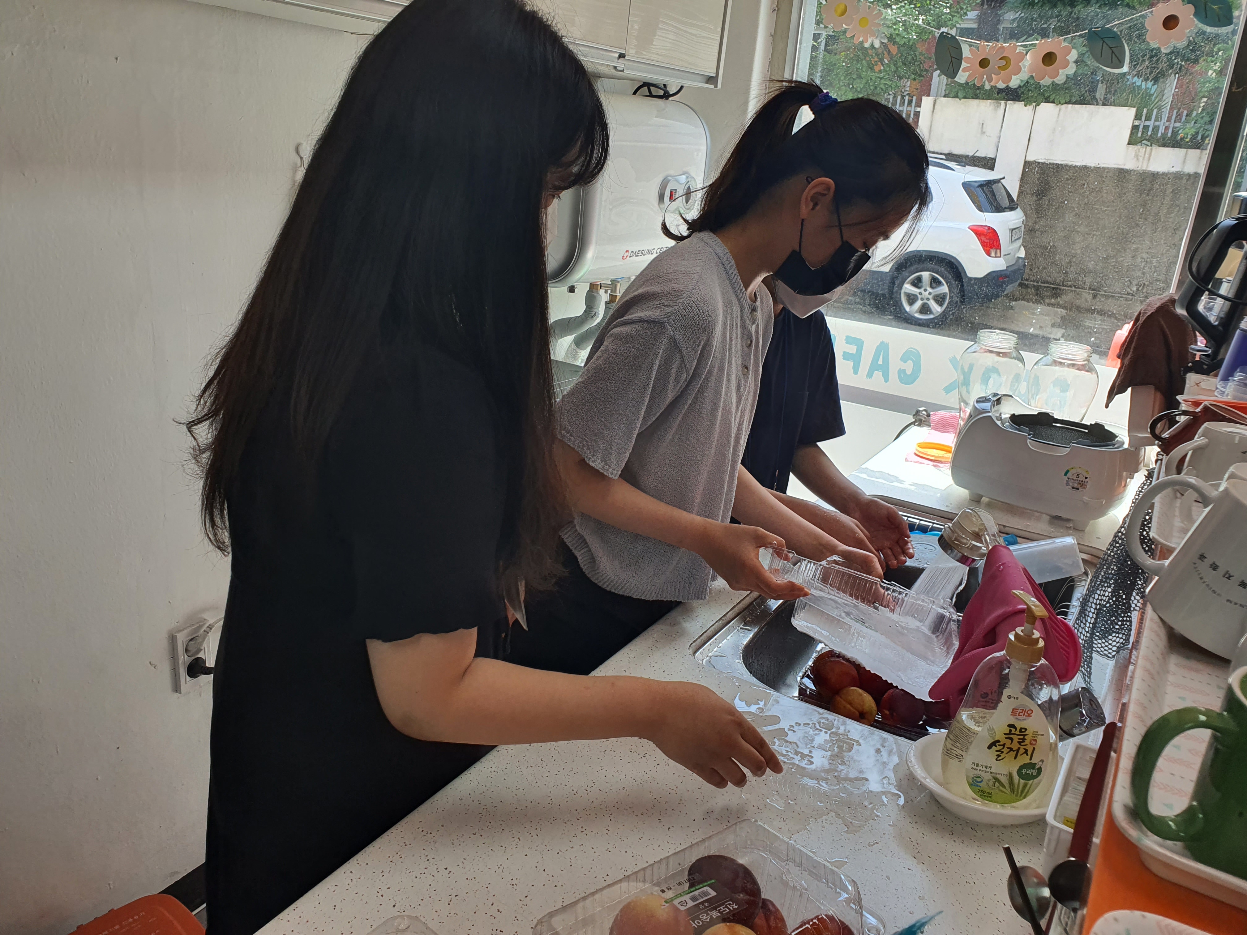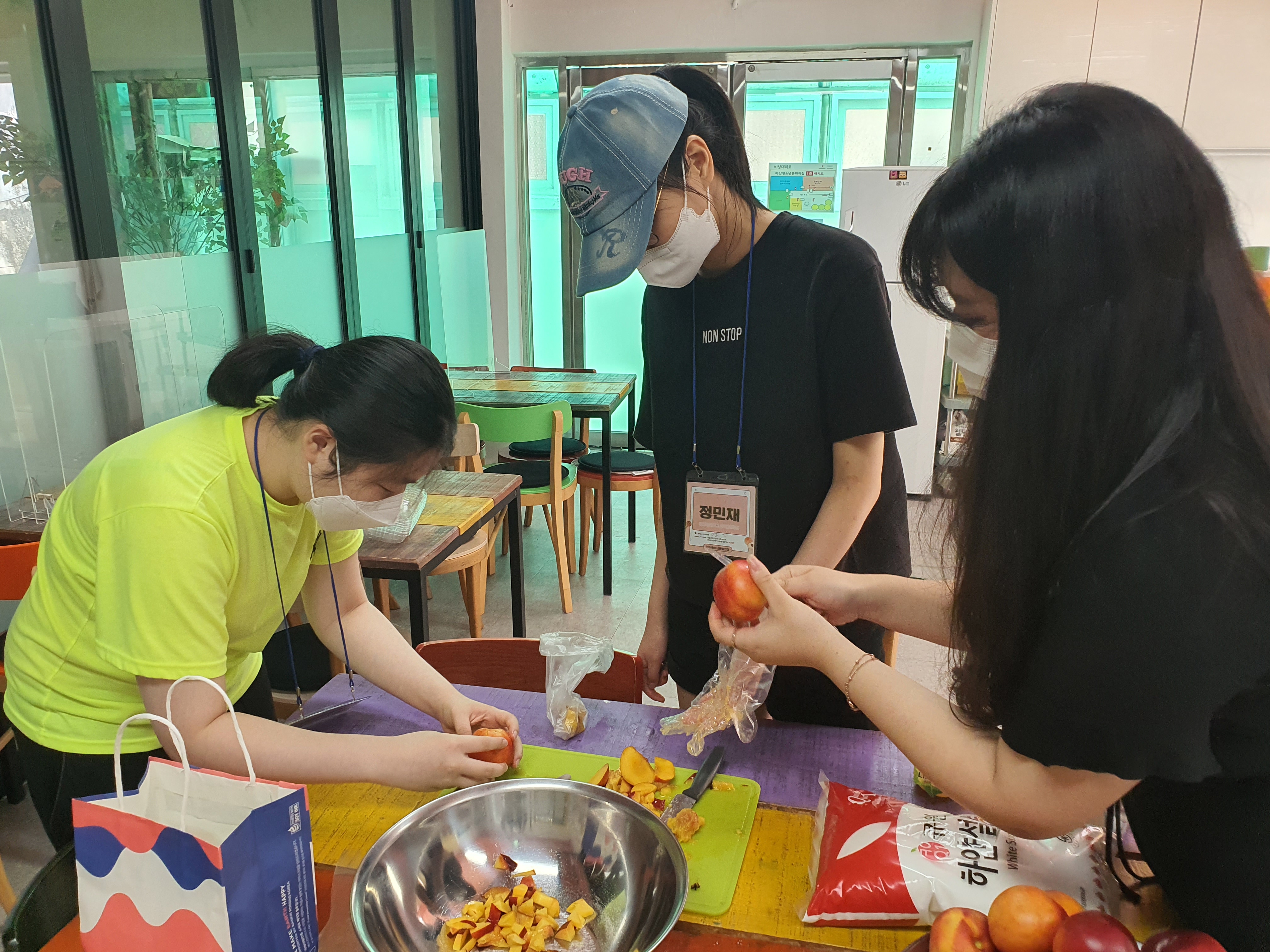청소년들이 직접 베이킹소다로 천도복숭아를 깨끗이 세척한 후 청을 담기좋은 크기로 잘랐답니다
