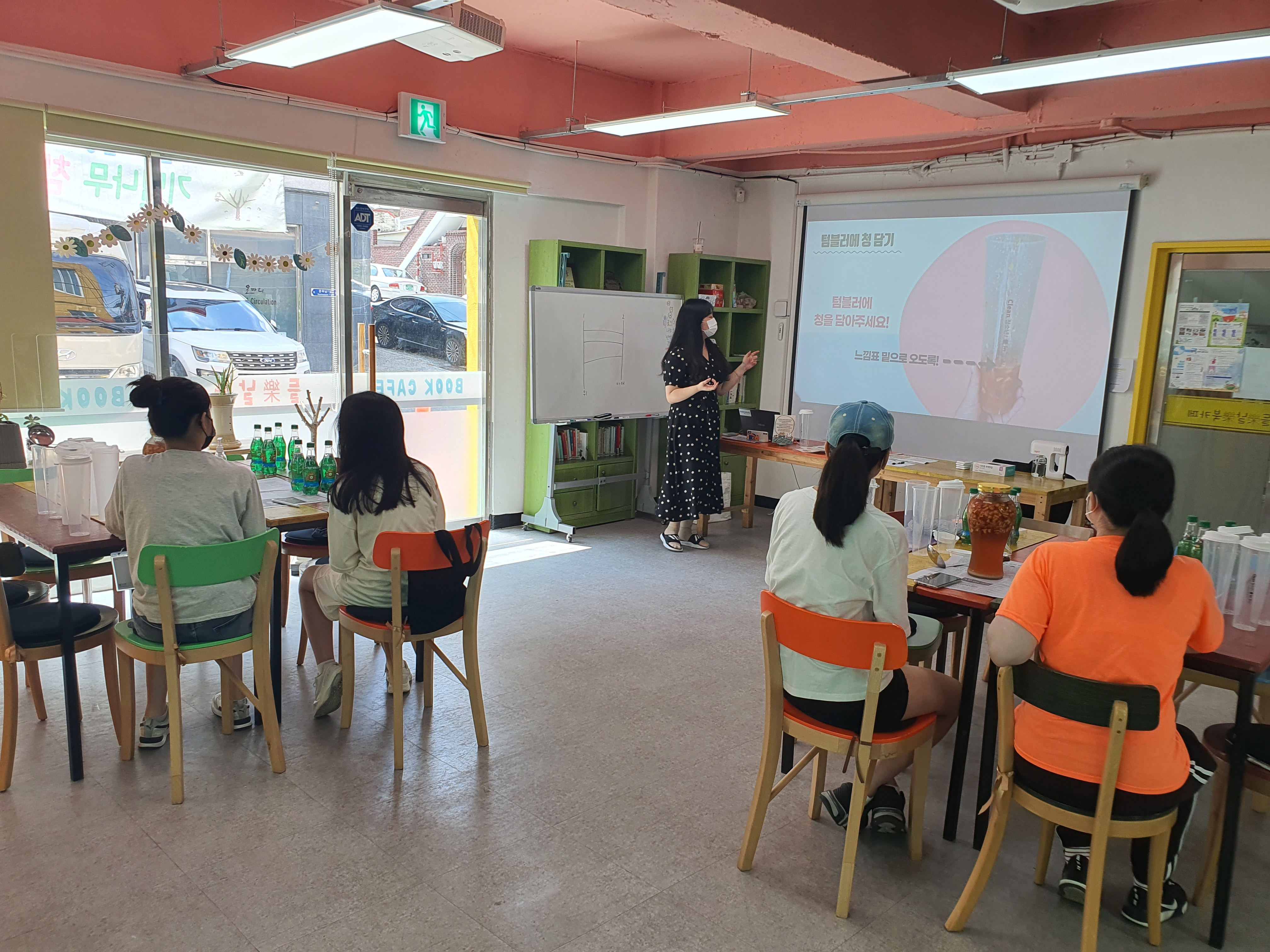 다회용 텀블러에 청을 나누어 담고 탄산수와 청소년들이 직접 작성한 안내라벨지를 붙혀