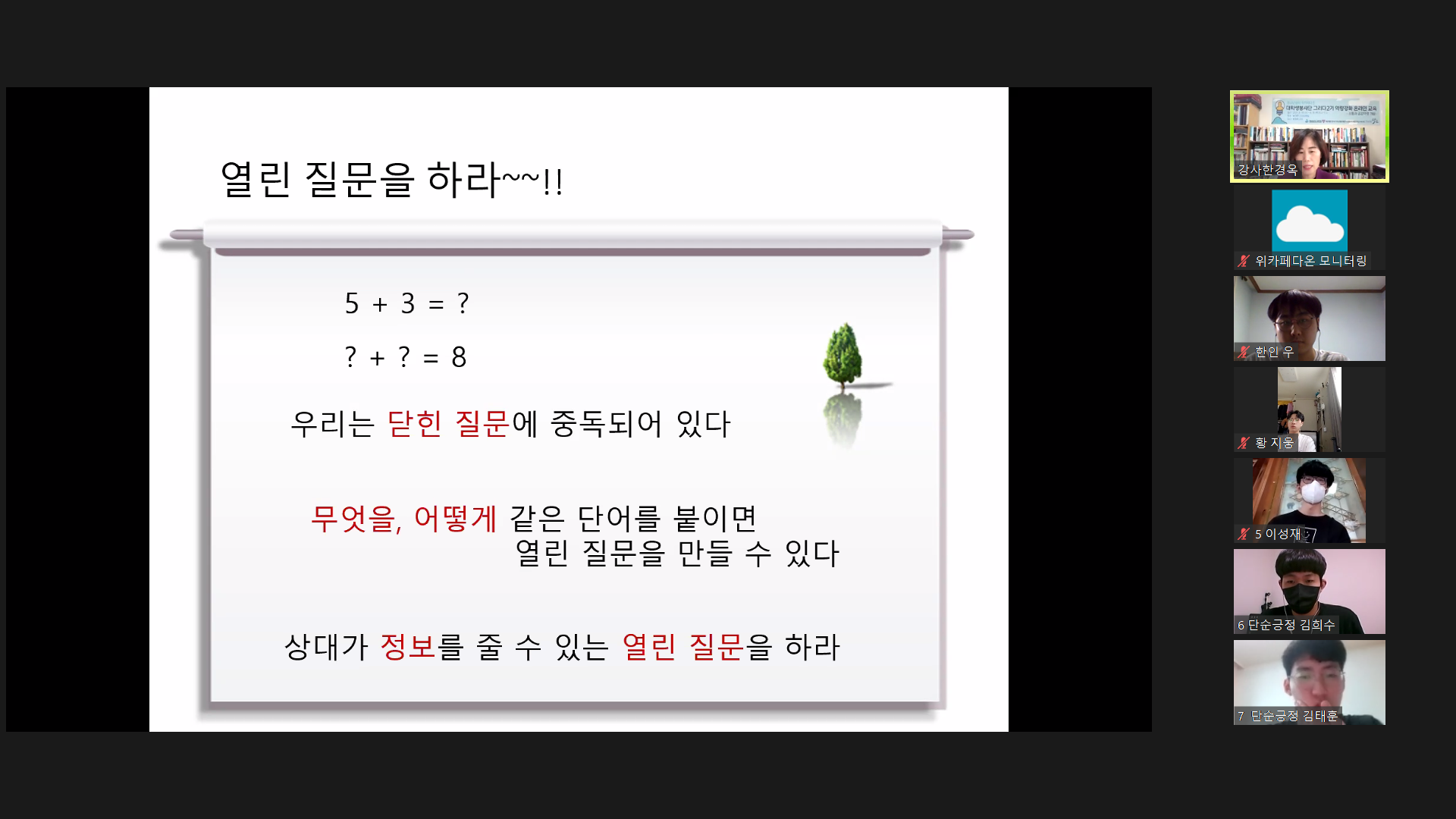우리는 닫힌 질문에 중독되어 있고, 열린질문을 통해 상대와 소통을 유연하게 끌어갈 수 있다는 내용이 많이 공감되었습니다. 닫힌질문을 자주 쓰고 "예, 아니오"가 유도되는 질문이 많았던 것 같다는 피드백이 있었습니다.
