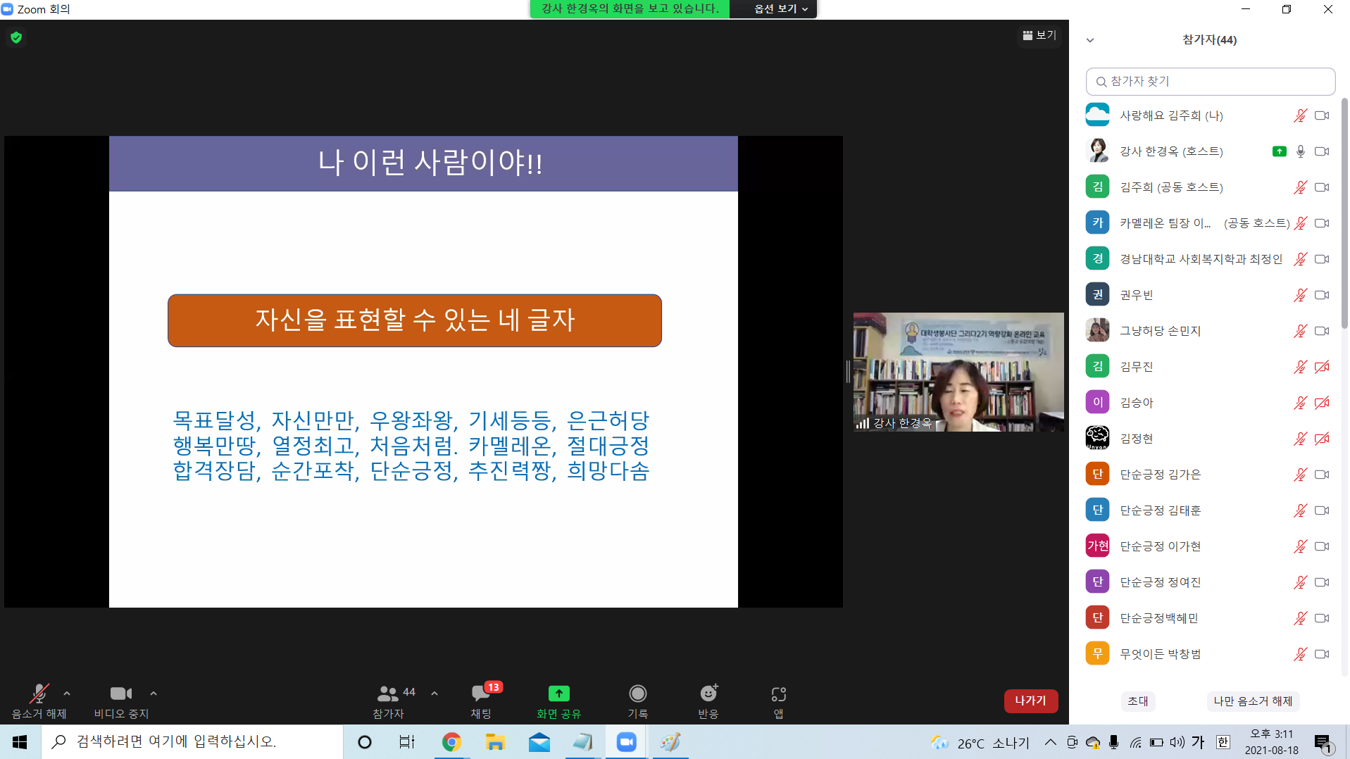 '나'를 표현하는 단어를 닉네임으로 설정하여 자기 자신을 표현하는 언어에 대해 생각해보고 간단히 소개하는 시간을 가졌습니다. 타인과 소통하고 공감하기 위해서 "나"에 대해 먼저 탐색하는 시간이 필요합니다:)