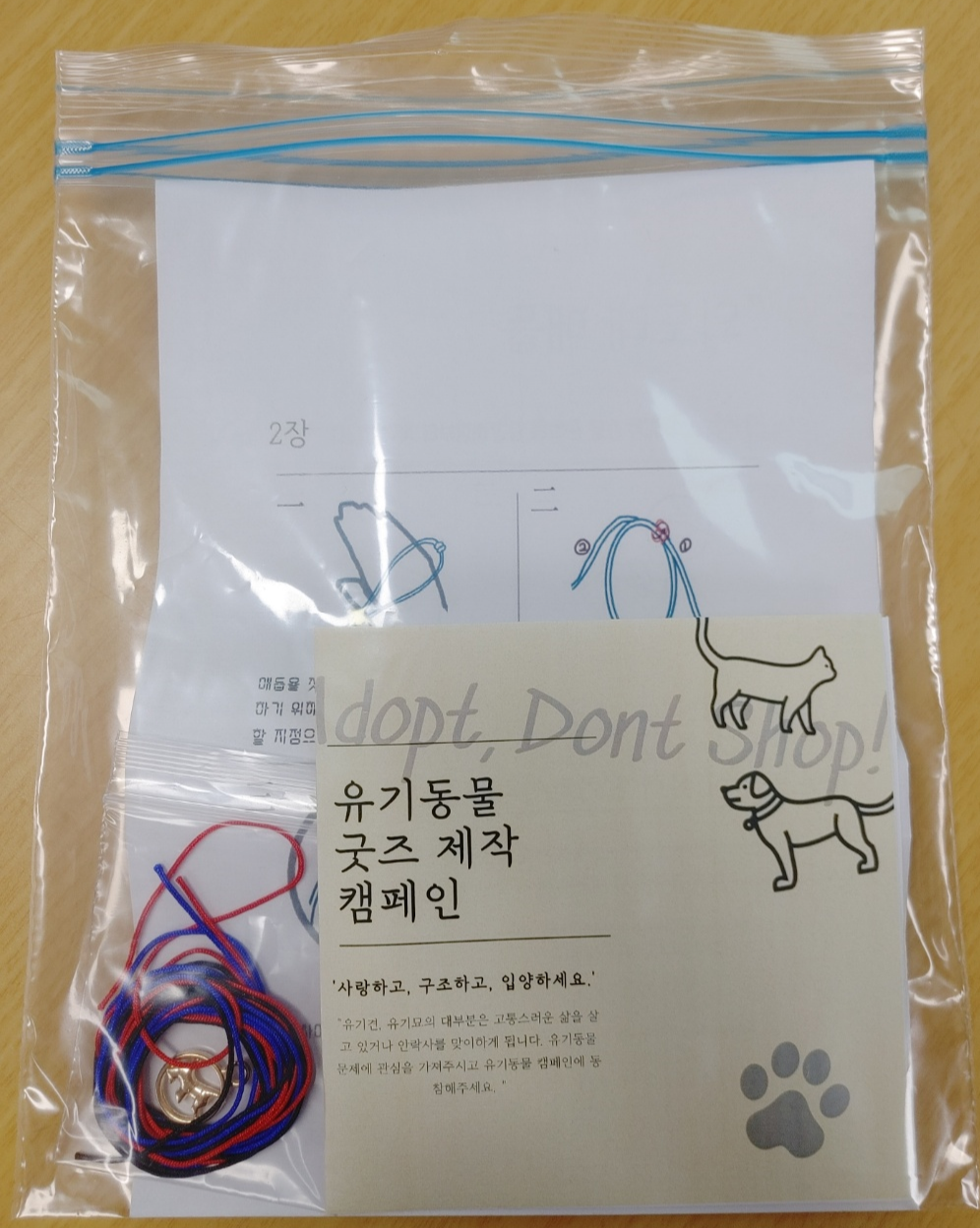 청소년들이 직접 유기견 보호를 위한 카드뉴스도 만들고 유기견을 생각하는 마음을 담을 수 있는 팔찌제작 키트를 제작, 배부하여 청소년어울림마당에 참여하는 청소년들에게 유기견 보호 캠페인을 진행하였습니다!