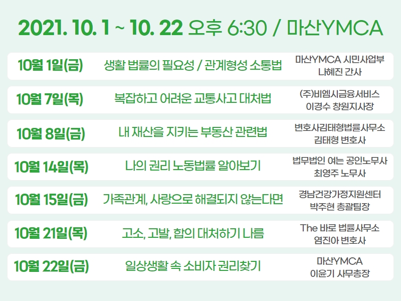 교통사고, 부동산, 노동, 가족관계, 고소고발, 소비자 등으로 구성된 이번 강의는 참여한 청년들에게 많은 호응을 얻었답니다.