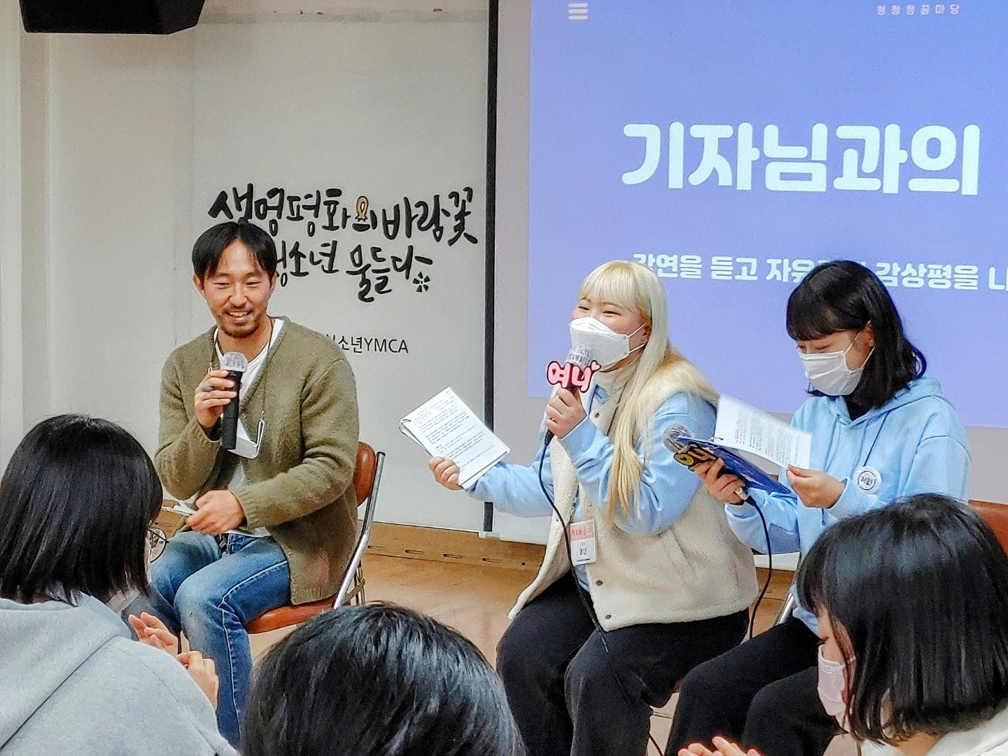 설문조사 결과 발표가 끝난 후 경남도민일보 최환석 기자의 특강과 이어서 감상평과 의견을 나누는 토크쇼가 함께 진행되었습니다! 최환석 기자는 평소 청소년 문화 등에 관심이 많았으며, 기자의 눈으로 바라본 청소년 문화와 청소년이 생각하는 문화의 차이에 대해서 질의응답 식으로 강의를 진행했습니다!