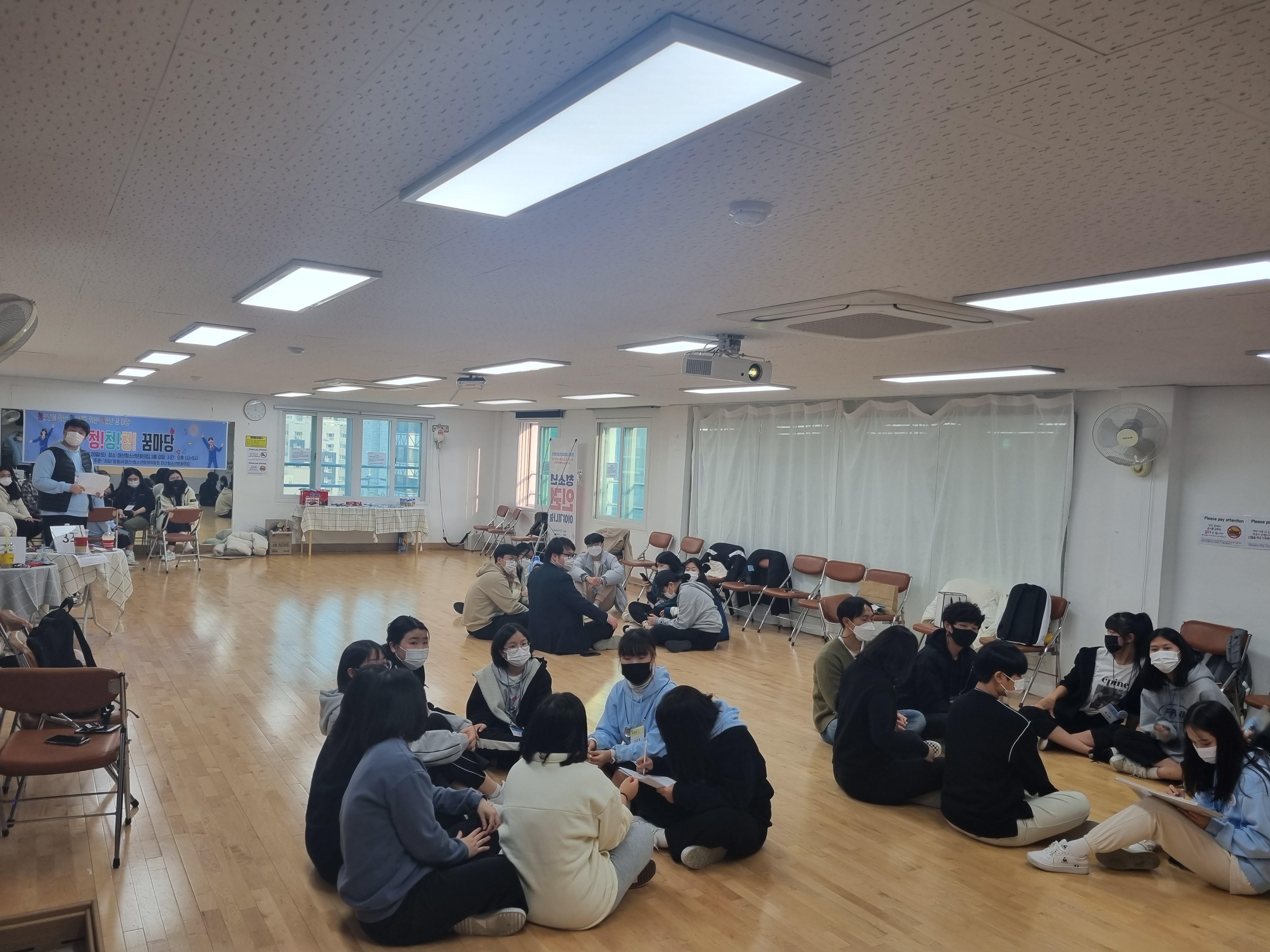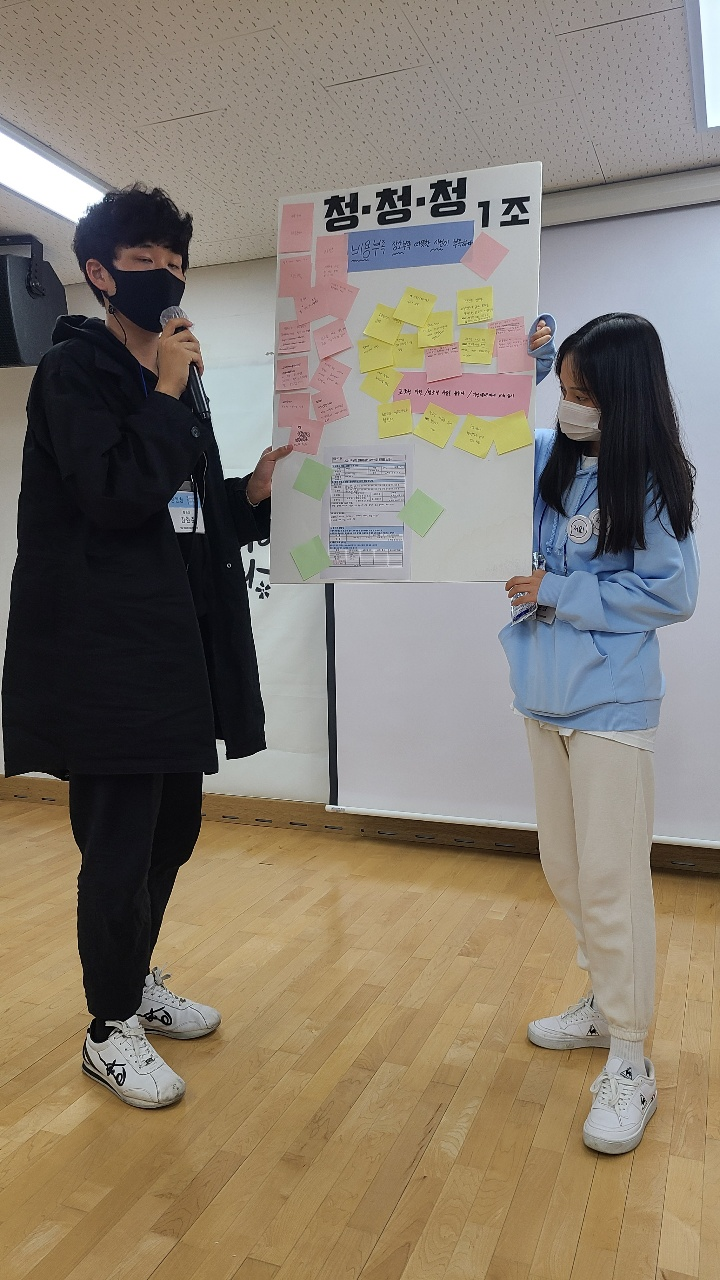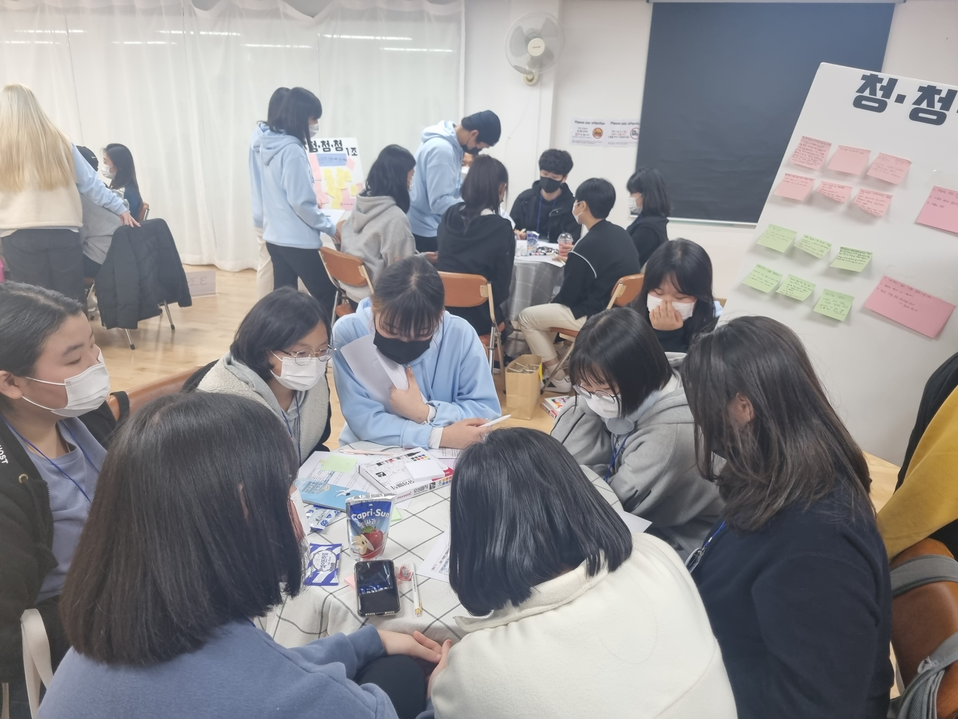 한바탕 신나게 놀고 난 뒤, 들떠있는 마음을 진정시킨 후 '청청청 꿈 마당'을 진행한 이유인 청소년 문화와 꿈에 대한 토론을 진행하였습니다! 참여위 위원들이 각 조에 속하여 토론을 진행했습니다!