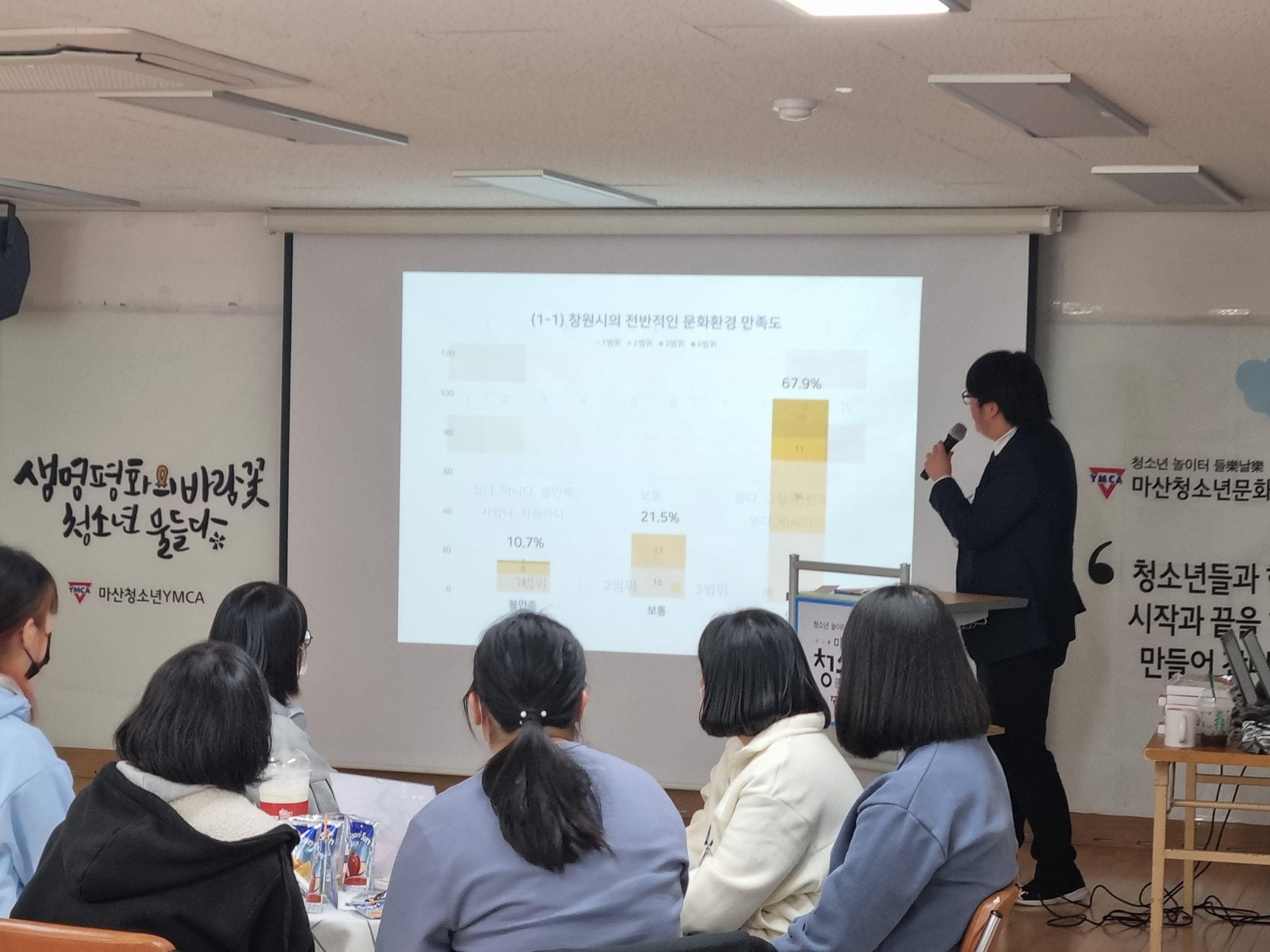 인사말씀에 이어 저요!창원시(마산)청소년참여위원회가 실시한 '창원시 청소년 문화환경 실태조사' 결과를 위원장인 김경훈 청소년이 발표하는 시간을 가졌습니다! 청소년 약 150여명을 대상으로 조사가 진행되었으며, 상업적 문화공간과 공공 문화공간을 나누어 만족도 조사를 실시하고 청소년문화정책에 관한 내용에 대해 조사해보았습니다.