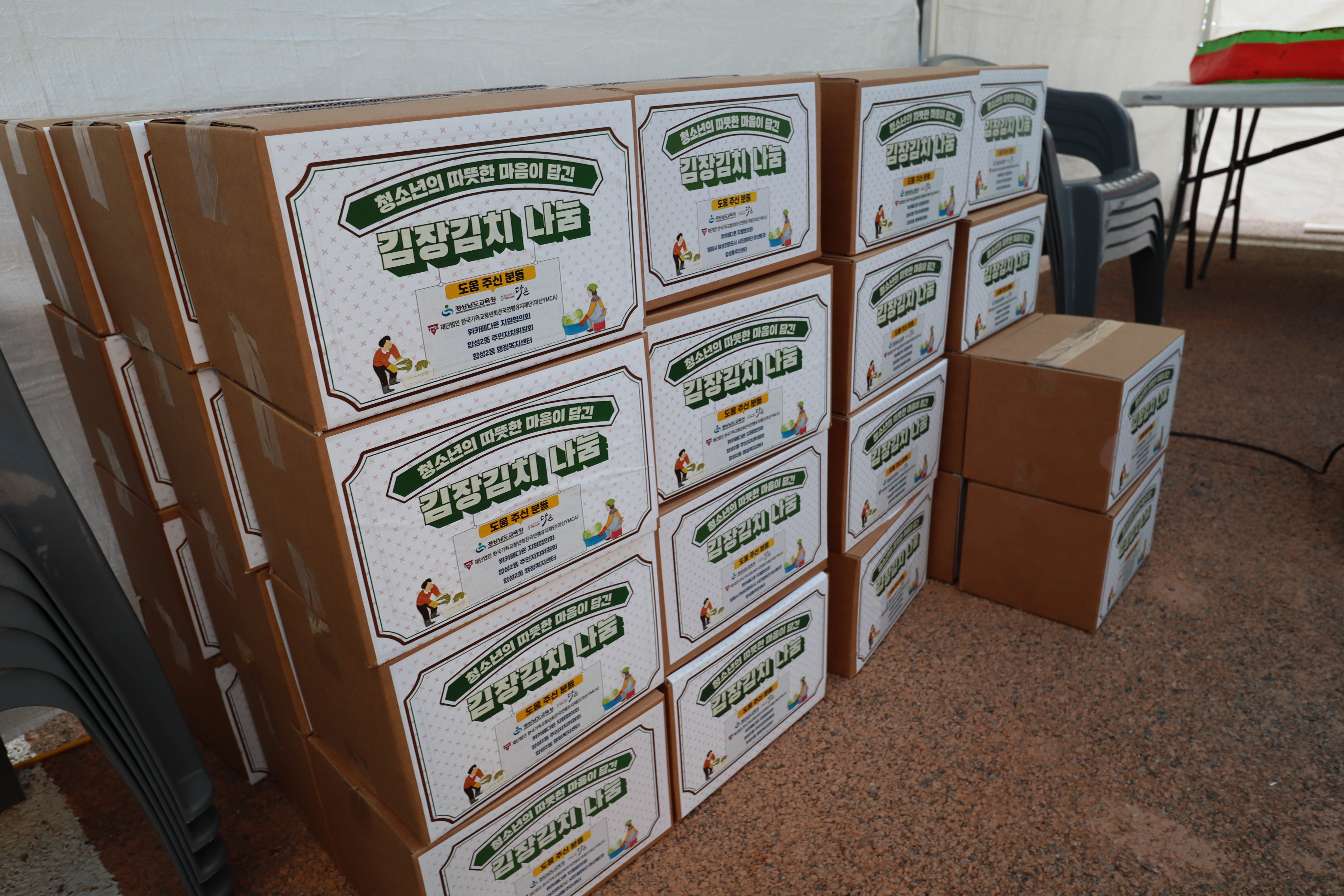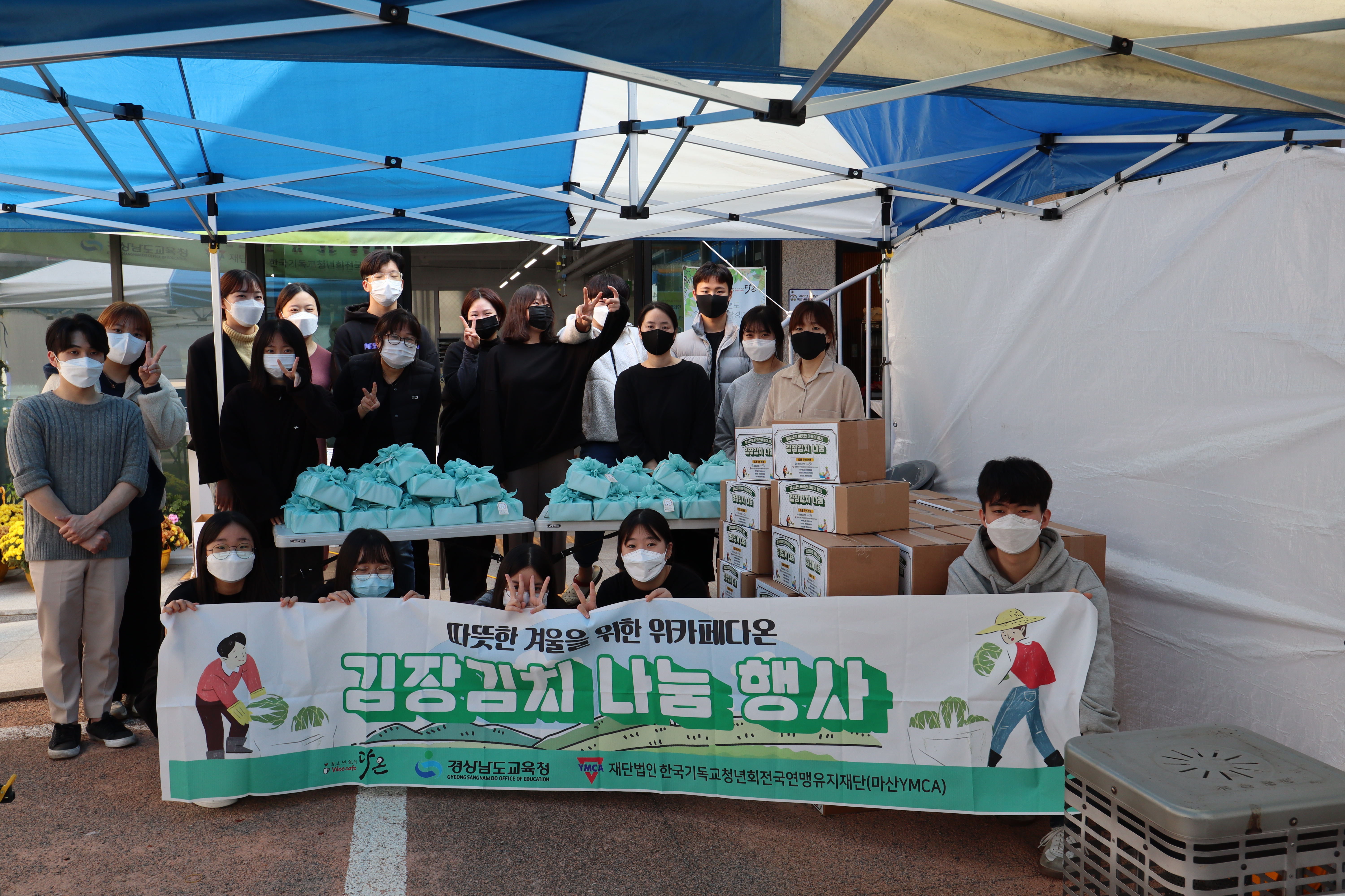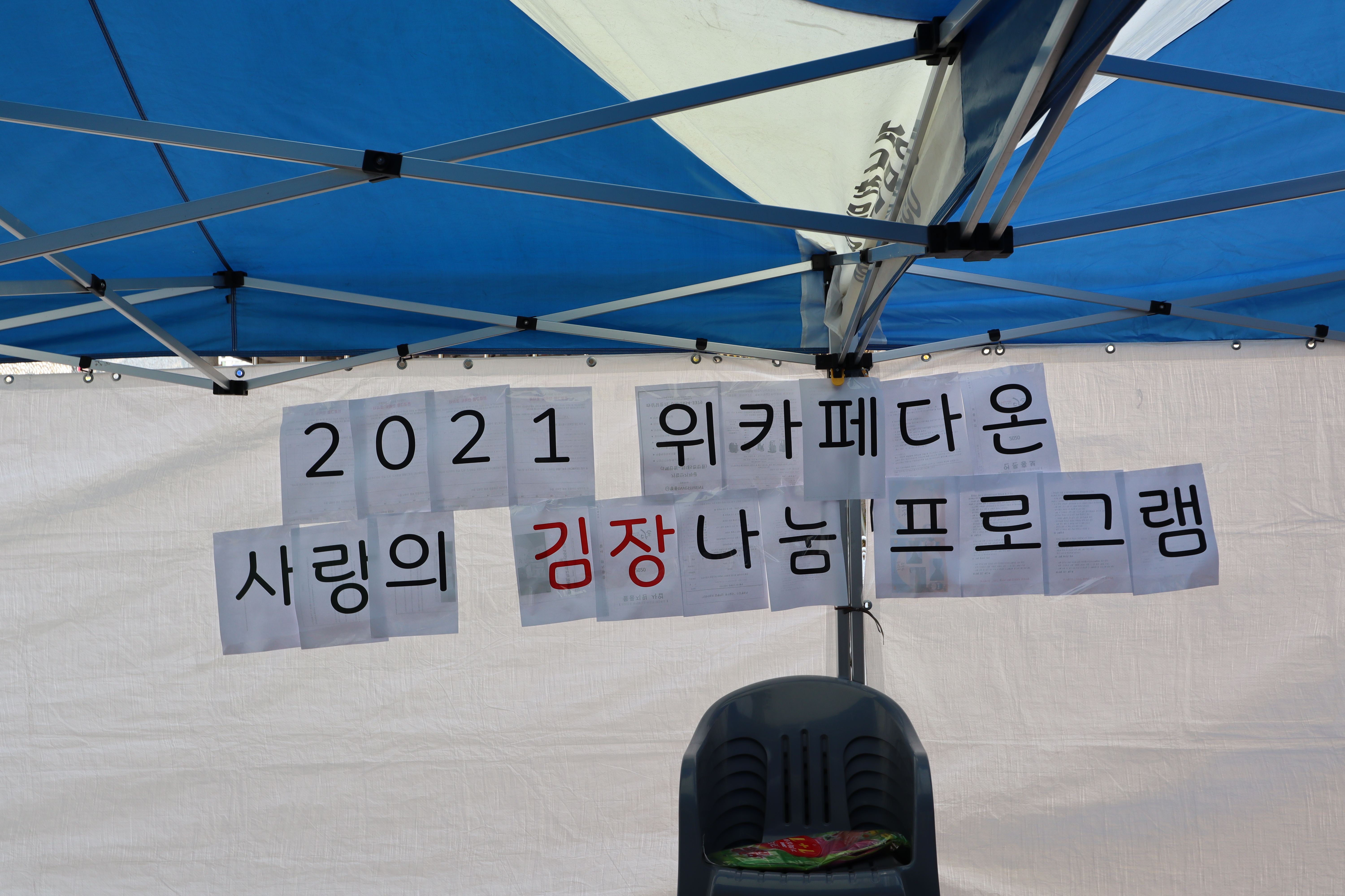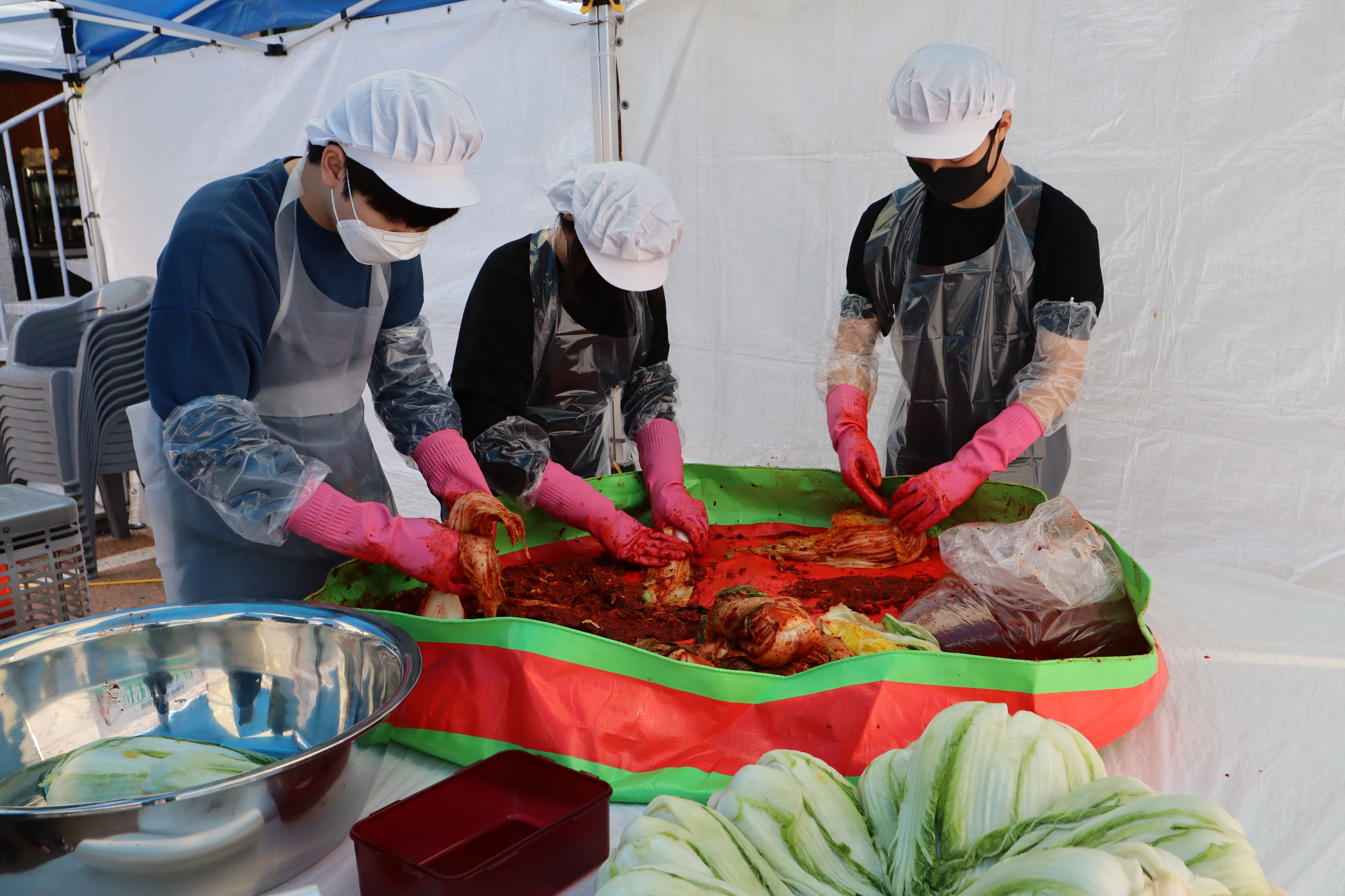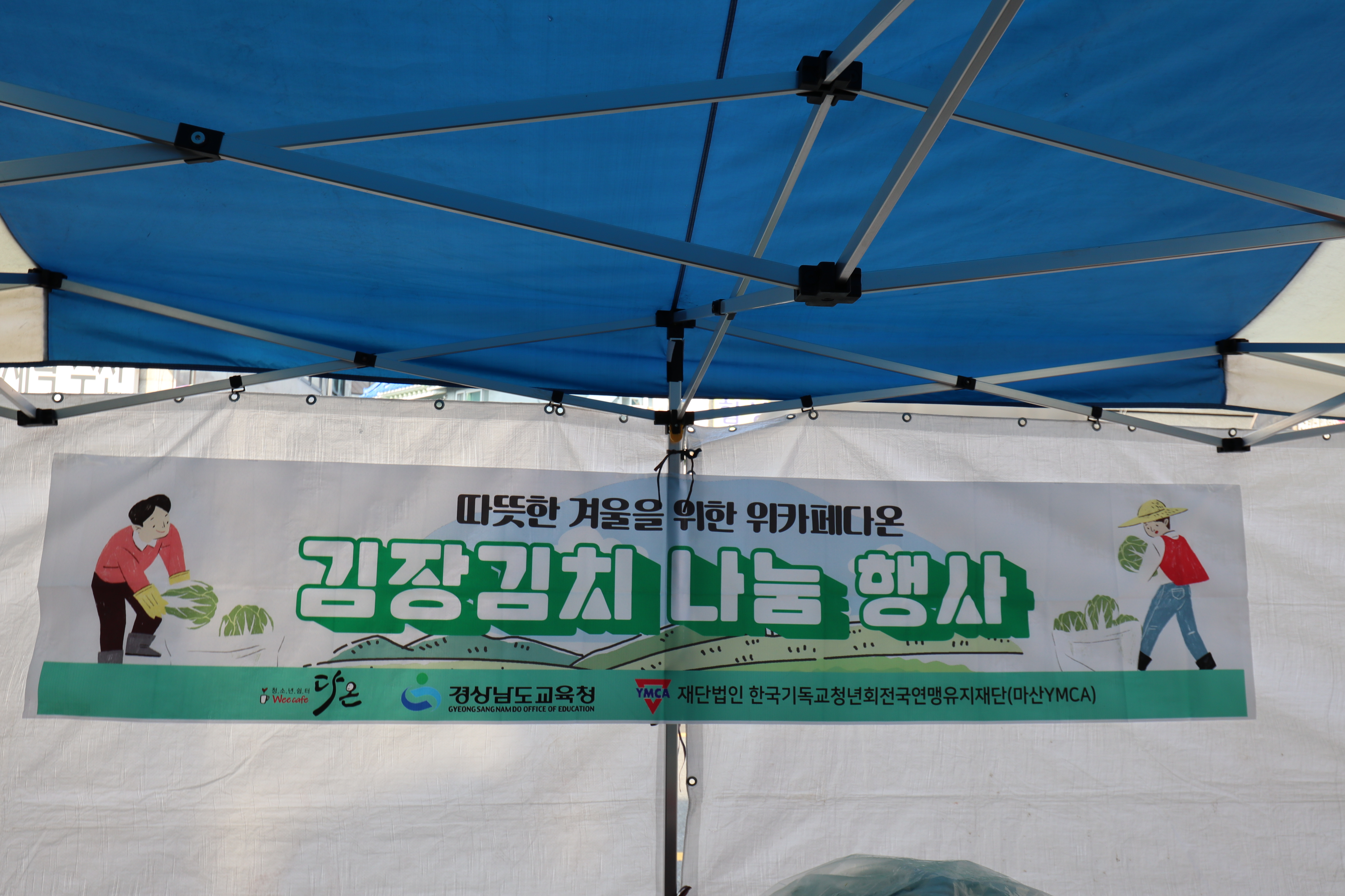 다온 앞마당에는 천막이 쳐지고 김장김치 나눔행사 현수막이 걸린다.