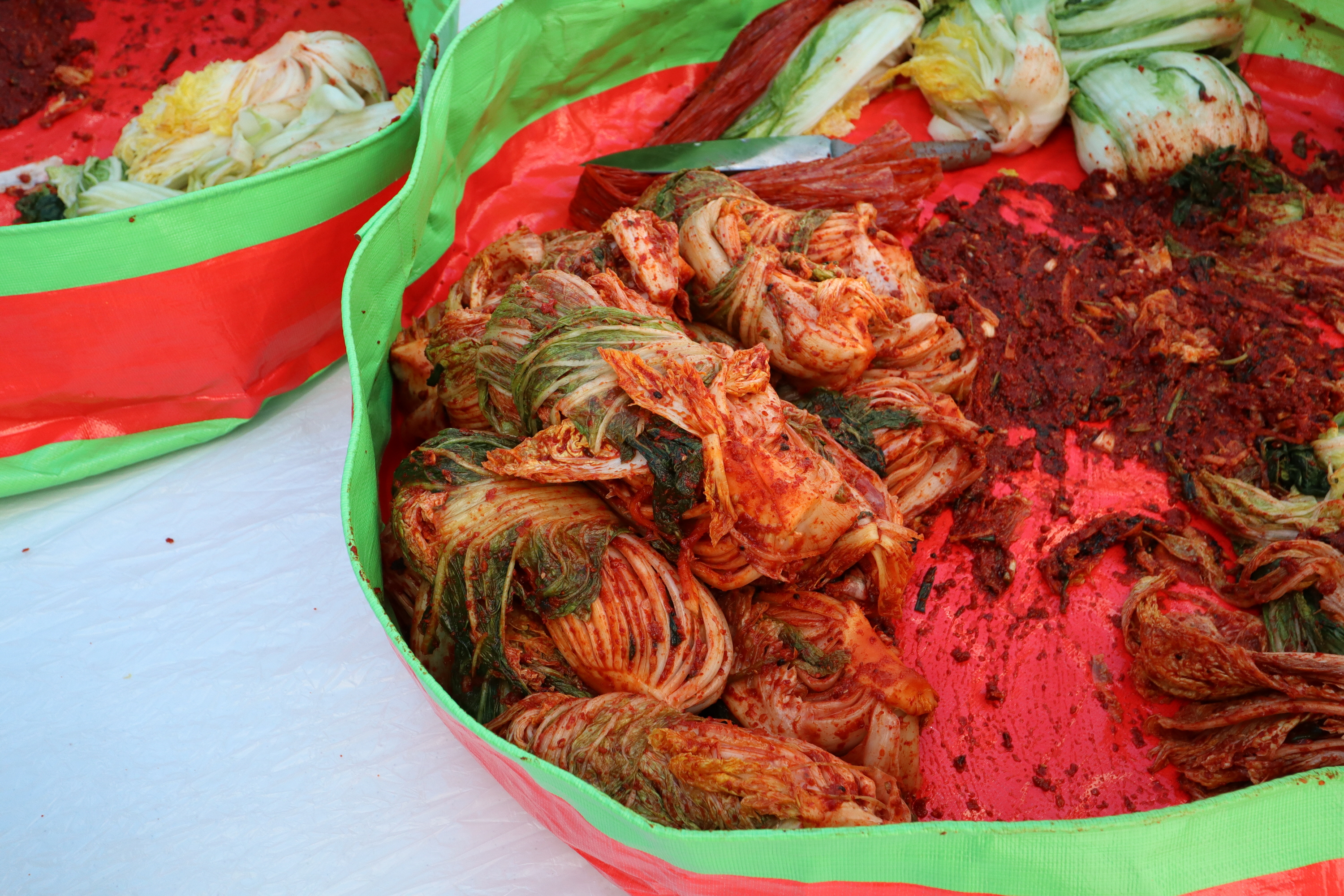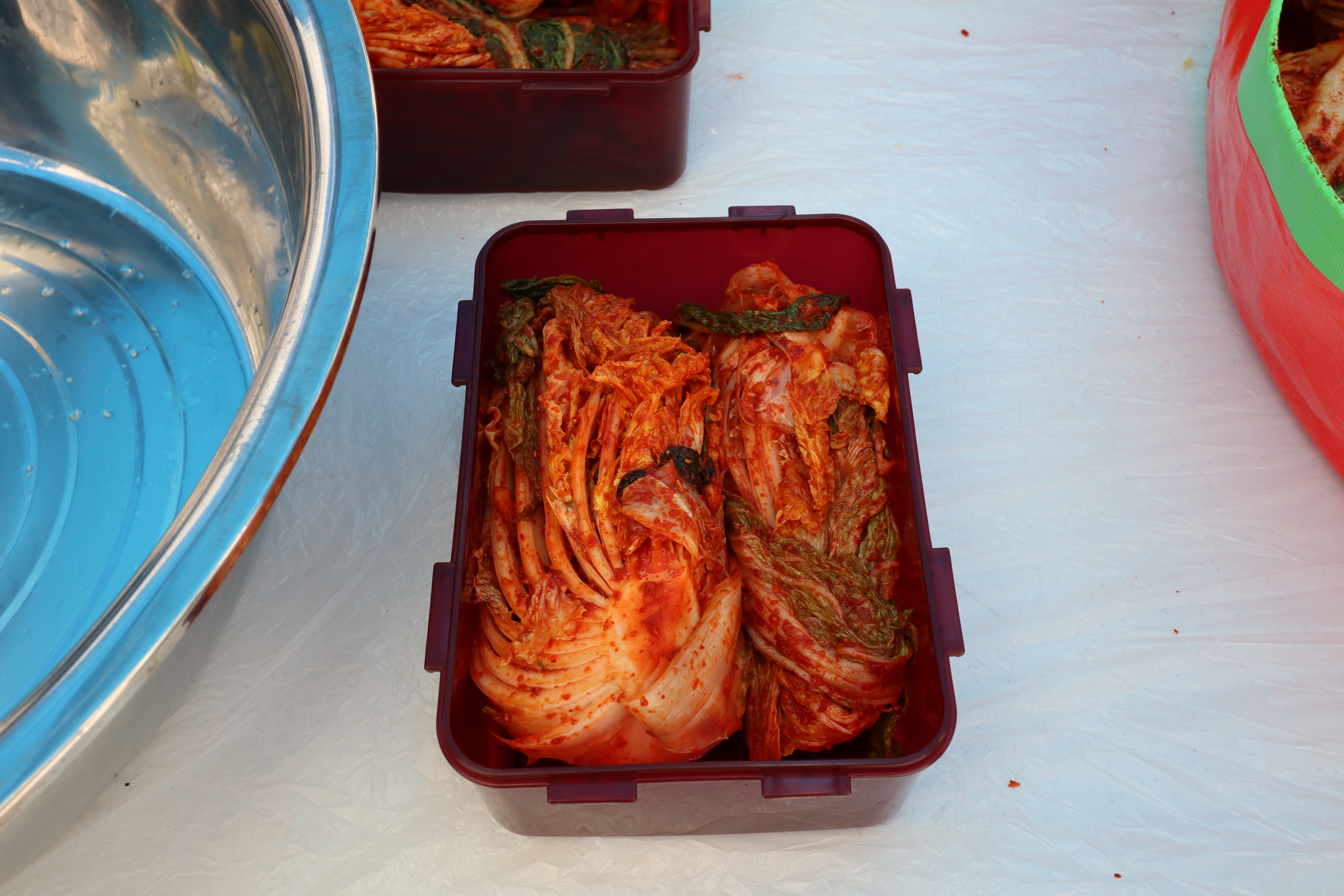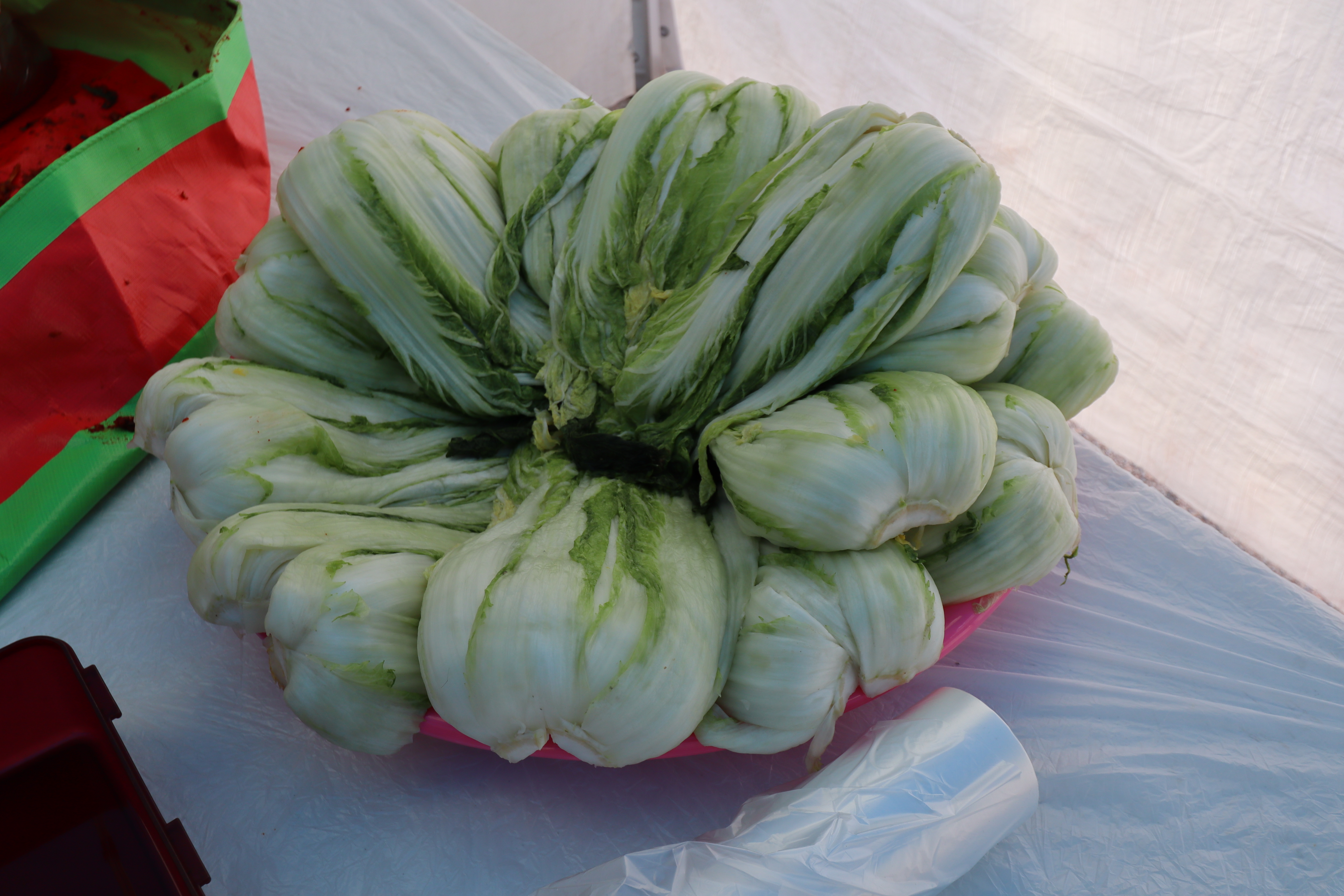 테이블 위에는 아직은 뽀얀 배추가 켜켜이 쌓여간다.