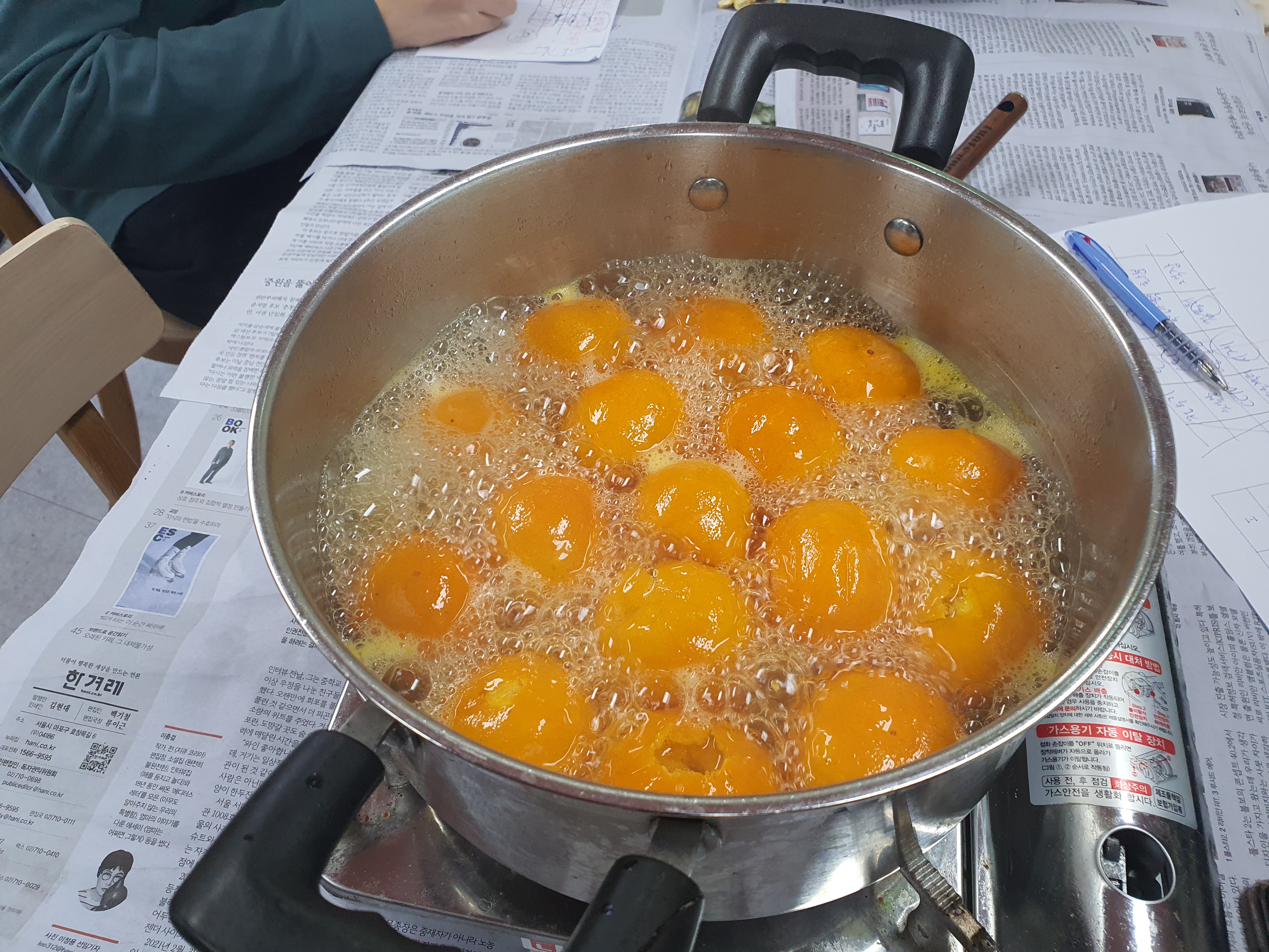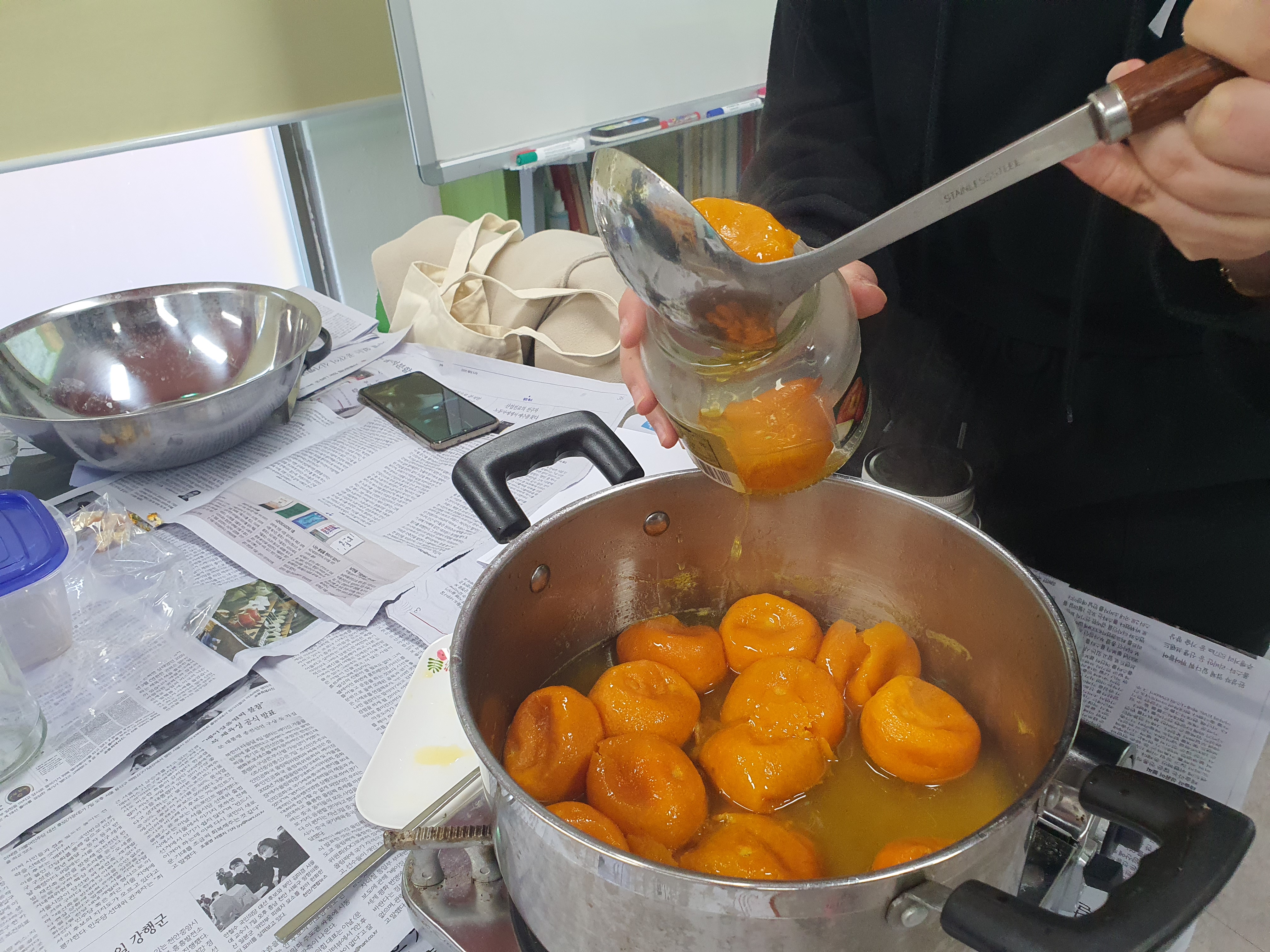 4. 귤이 쪼글쪼글해지고 물이 어느정도 자박해지면 불을 끄고 한 김 식힌 뒤 가져온 용기에 담아줍니다.