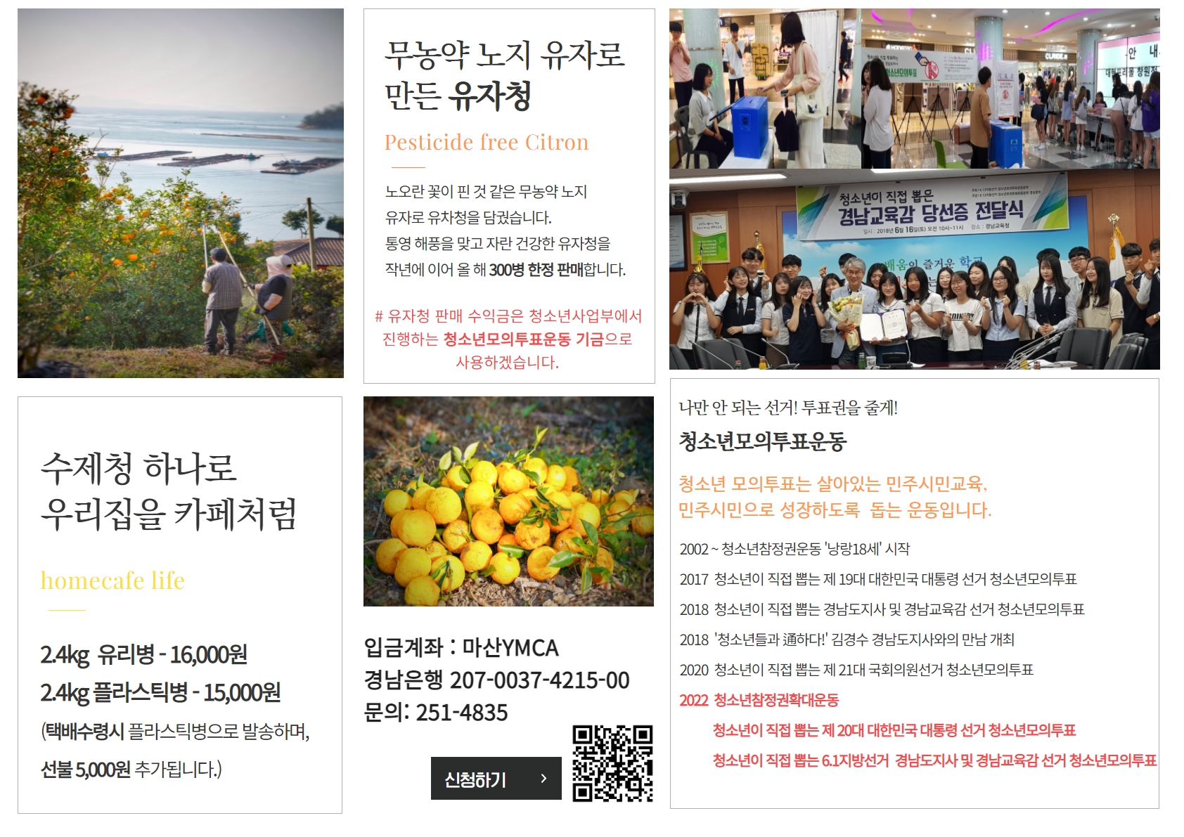 올 겨울 초, 회원활동위원회가 도농교류의 일환으로 무농약 유자청 판매사업을 하였습니다. 통영에서 문해교육을 받은 어르신이 노지 유자로 만든 무농약 유자청입니다. 유자청 판매를 기획하면서 수익금은 전부 청소년사업부가 진행하고 있는 청소년모의투표운동에 전달하기로 하였습니다.
