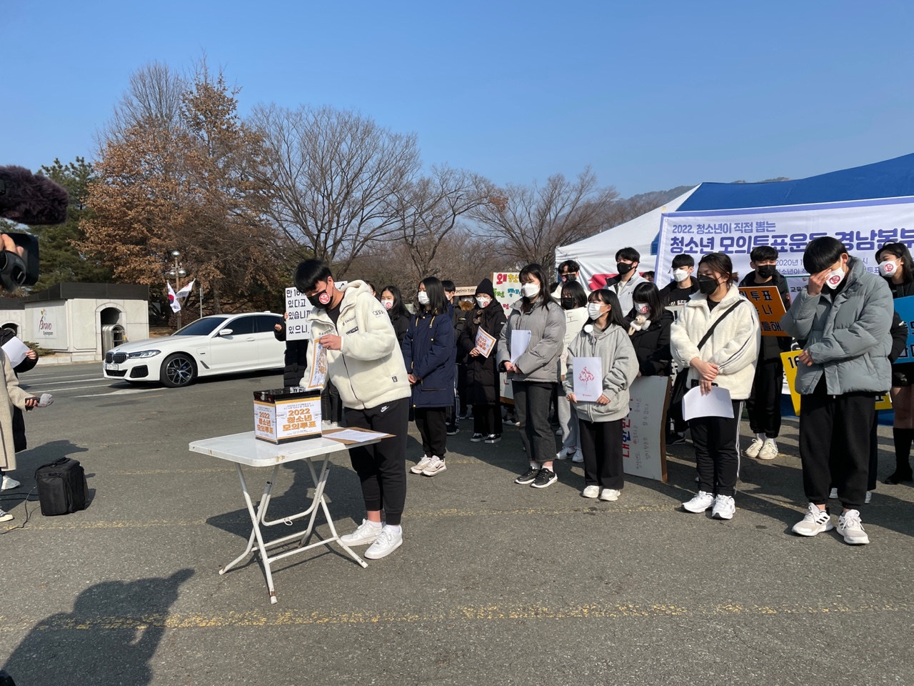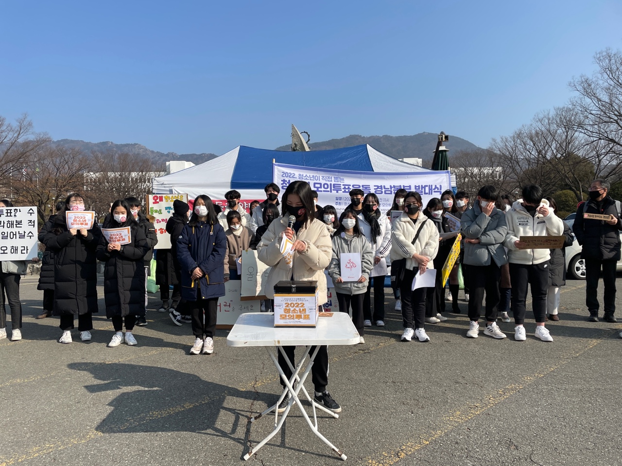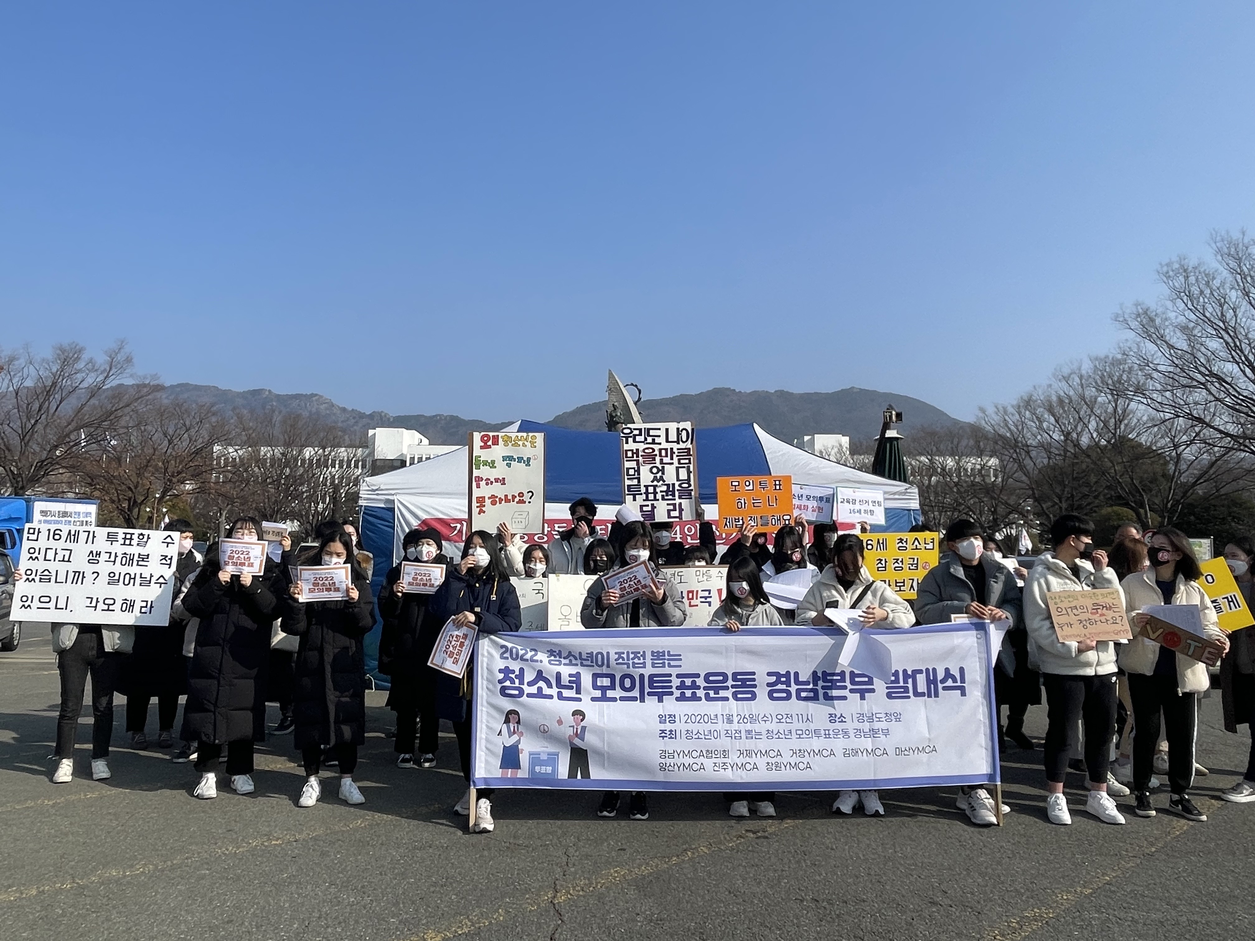 지난 1월 26일(수) 경남 7개청소년YMCA 청소년회원들과 실무자 40명이 경남도청 앞에서 '청소년이 직접 뽑는 청소년모의투표운동 경남본부' 발대식을 진행하였습니다.