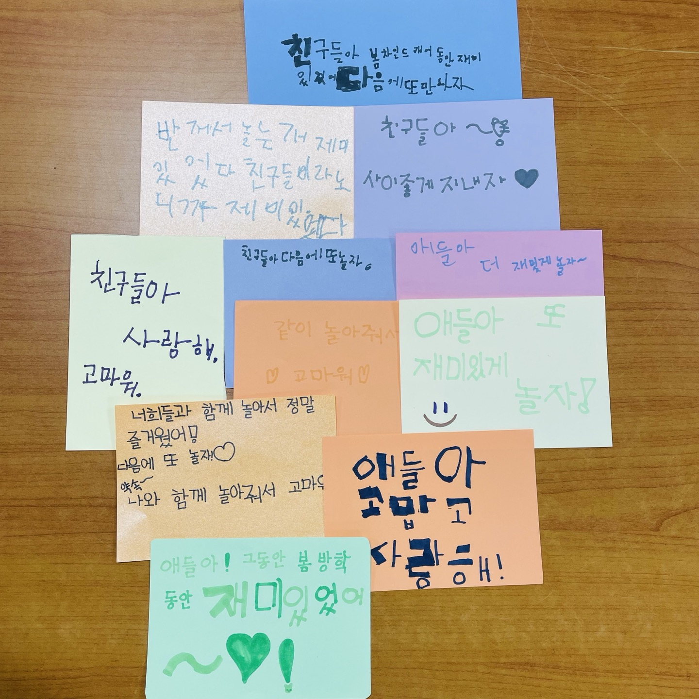 친구들과 함께 한 방학 동안 많이 친해졌고 많이 의지했던 거 같아요. 11명의 아이들이 친구들에게 하고 싶은 이야기를 작은 종이에 빼곡히 적었답니다. 방학 동안 행복한 시간 좋은 추억들이 아이들 글에 담겨있는 거 같아요.