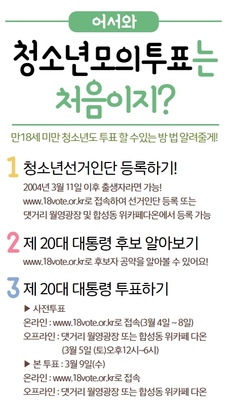 만18세이하 청소년들이 직접 참여 할 수 있는 청소년모의투표 운동에 많이 참여해주세요!