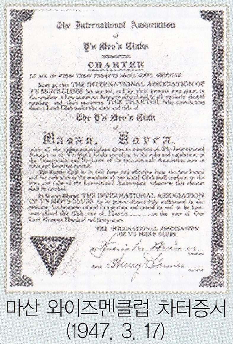 1947년 마산에서 창립한 와이즈멘 마산클럽은 부산클럽(1946. 3. 14), 서울클럽(1947. 2.8), 진주클럽(1947. 3)에 이어 네번째입니다. 1947년 6월에 창립한 거제클럽과 함께 5개 클럽이 한국지구로 국제본부의 인정을 받았다고 합니다.