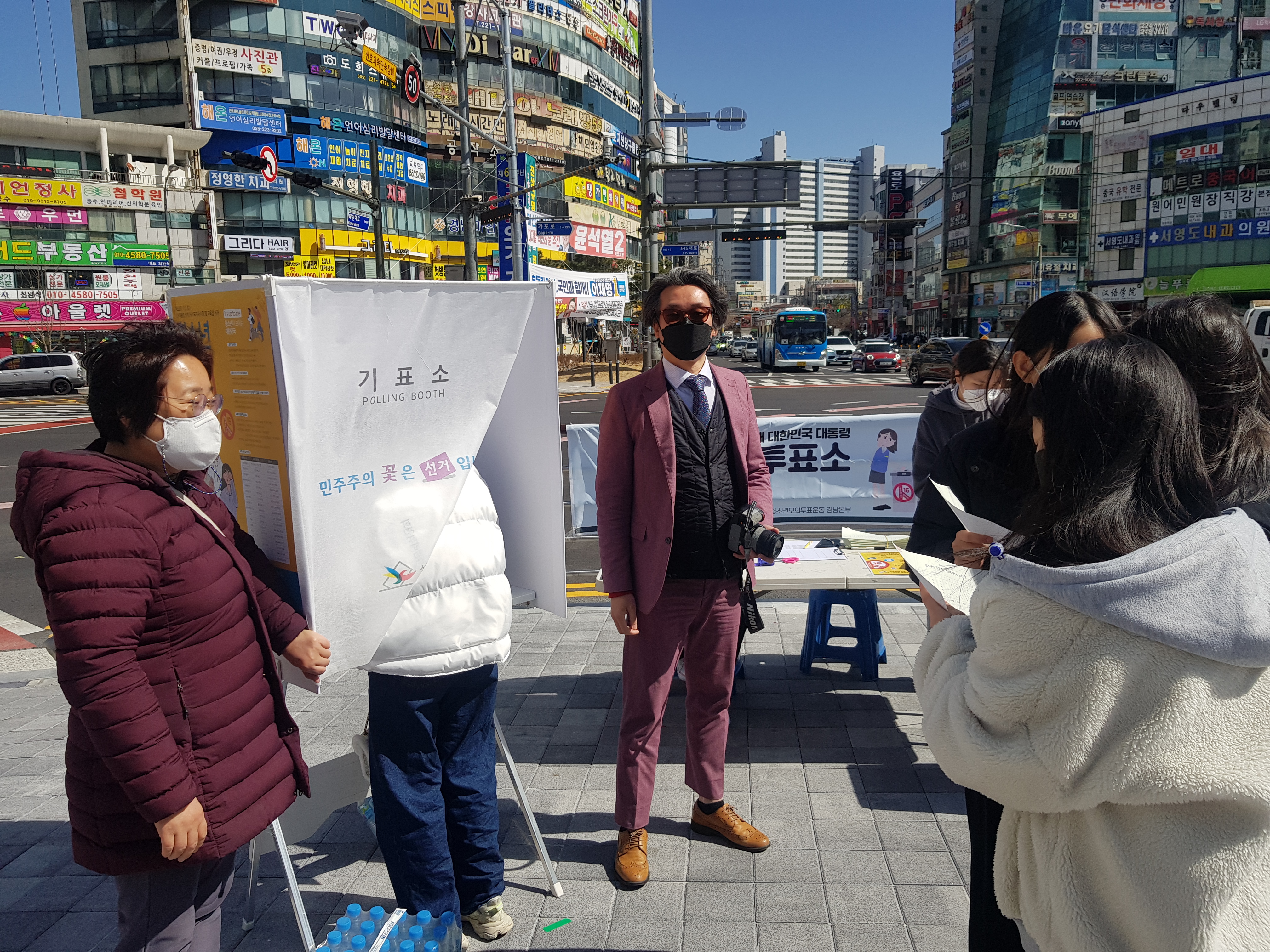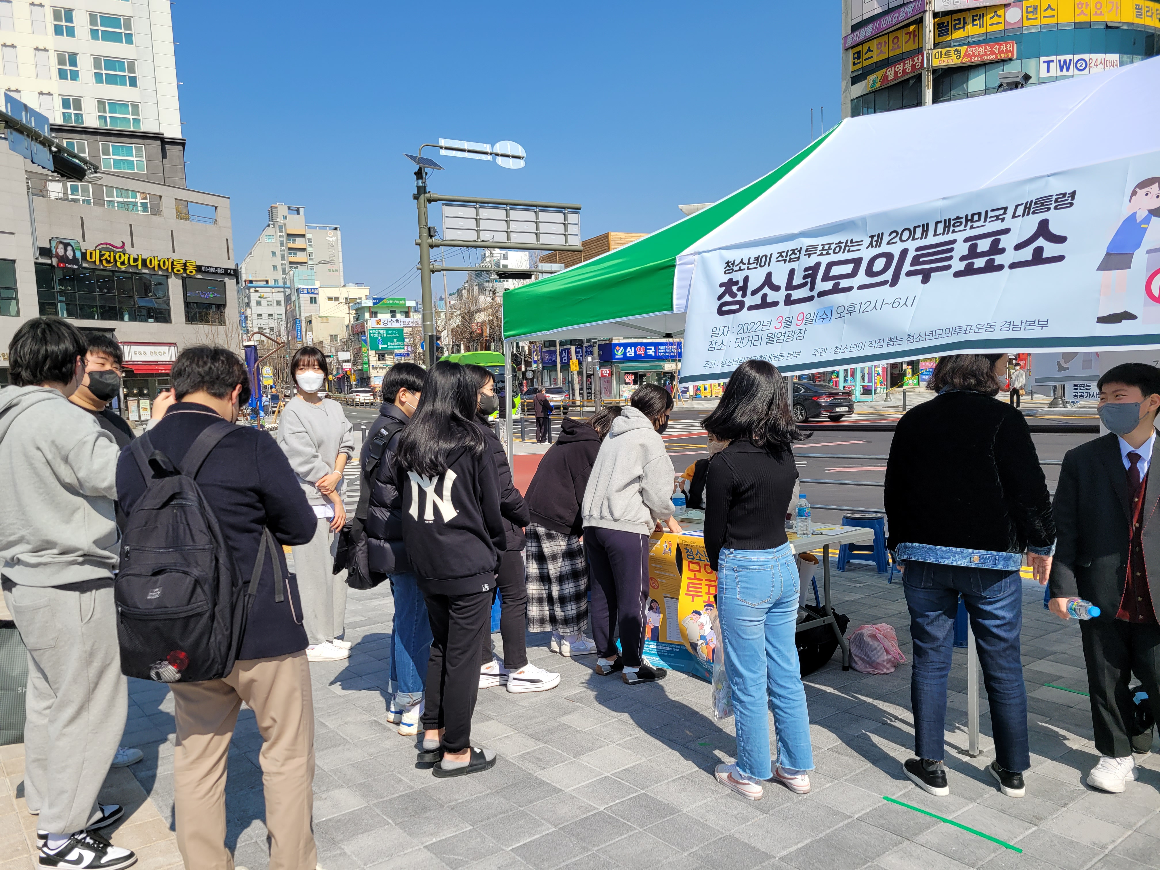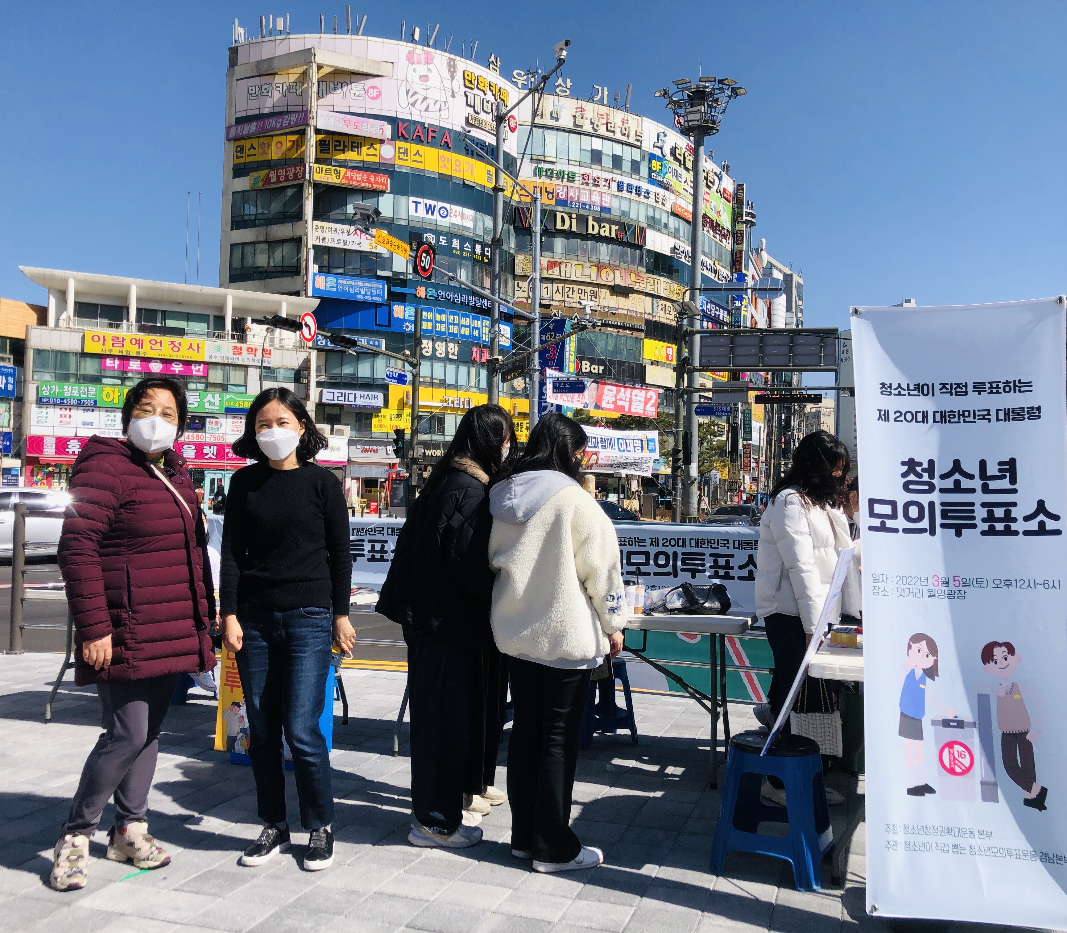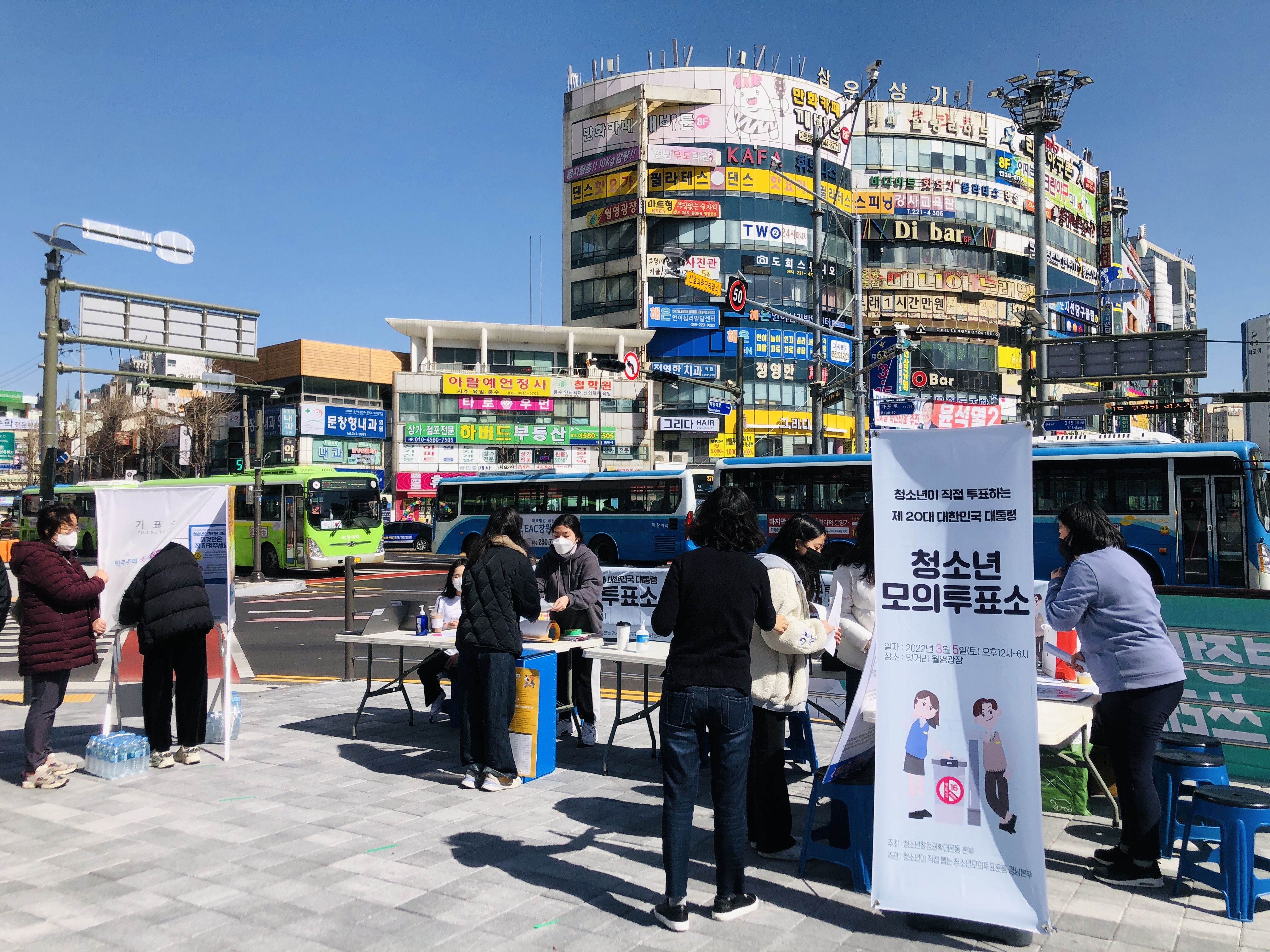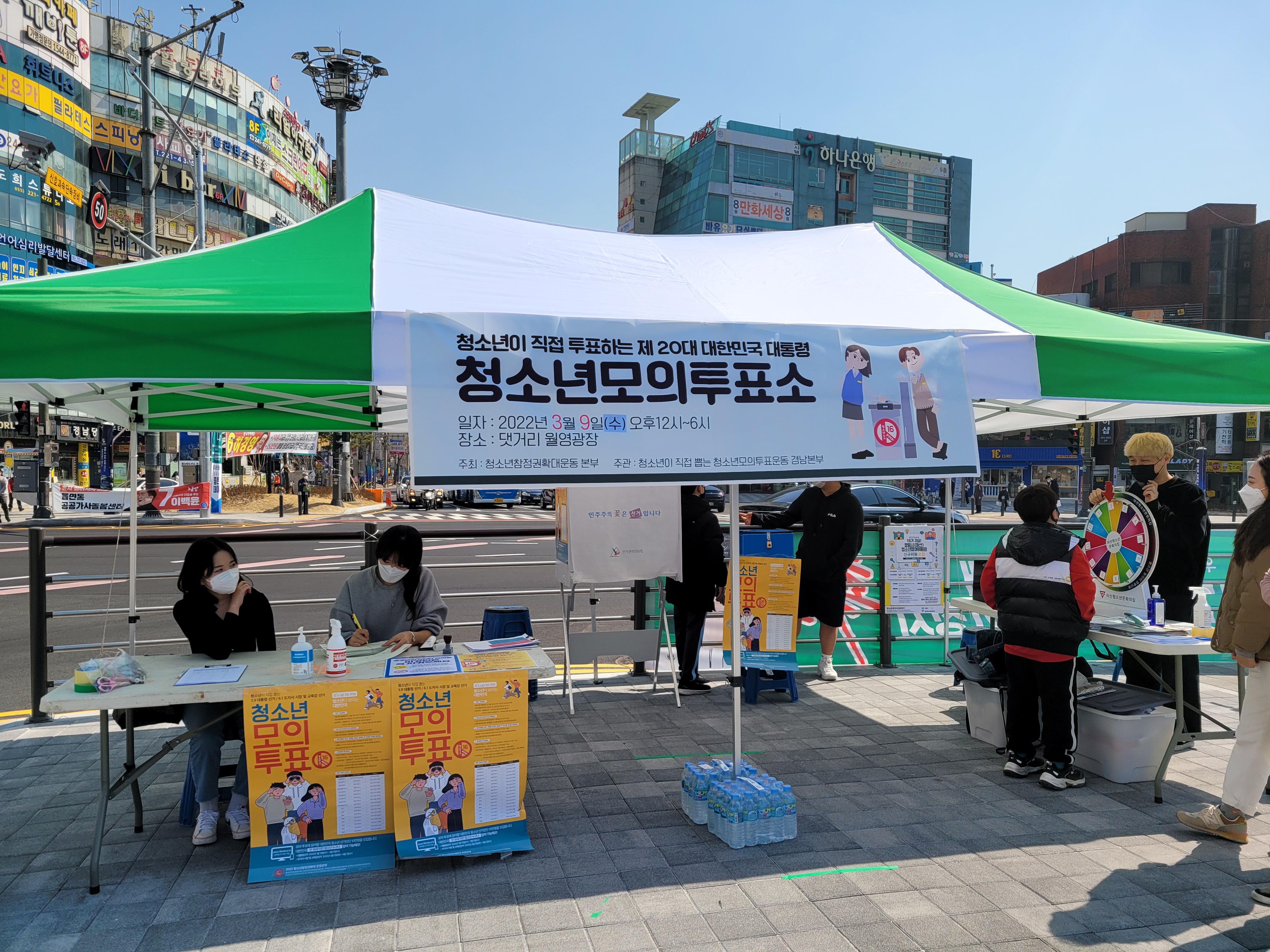 마산청소년YMCA 회원들이 3월 5일, 3월 9일 마산 댓거리 월영광장과 합성동 위카페 다온에서 청소년이 직접 뽑는 제 20대 대한민국 대통령 청소년모의투표에 지역청소년들이 직접 참여할 수 있도록 오프라인 투표소를 운영하였습니다.