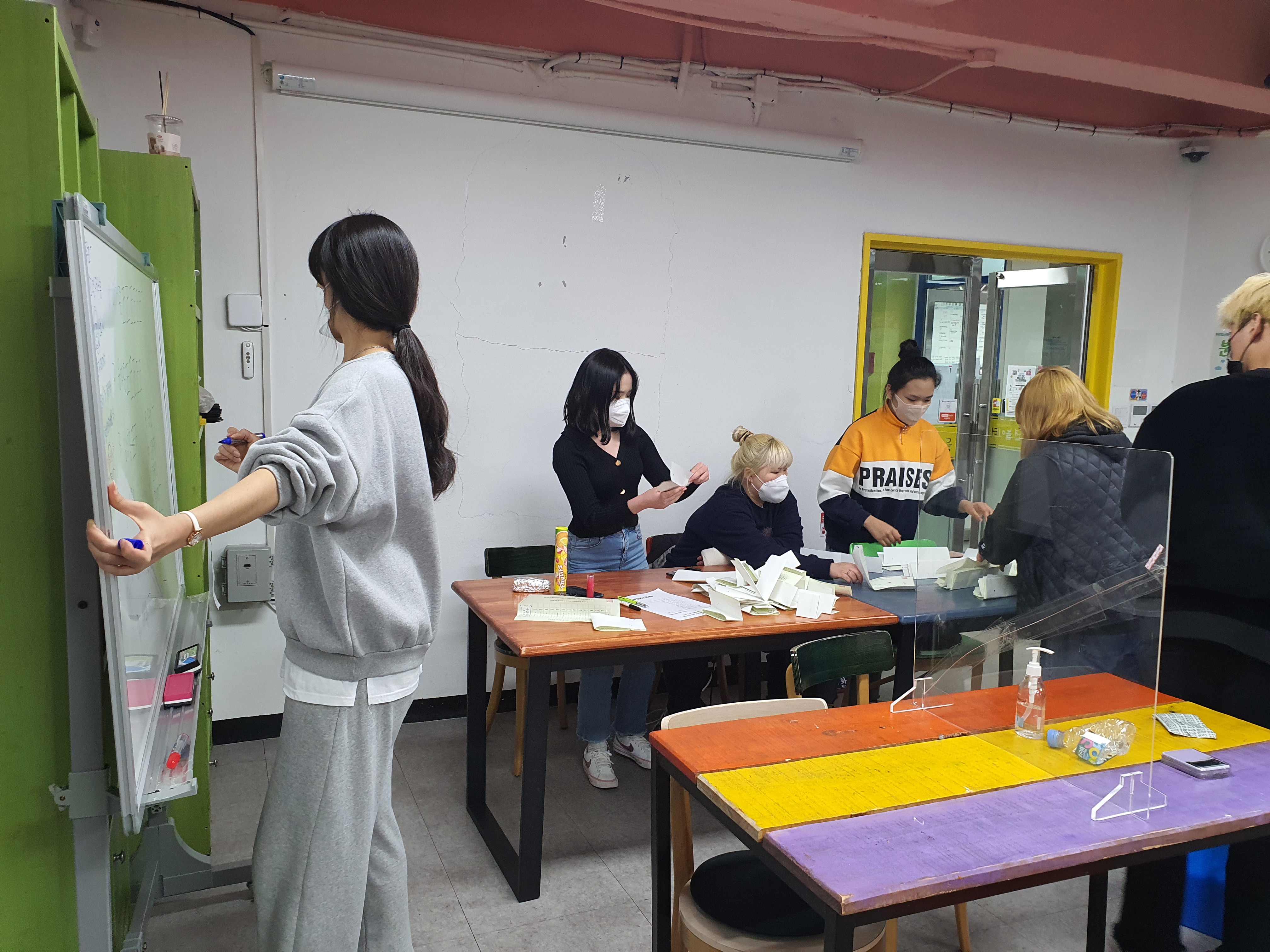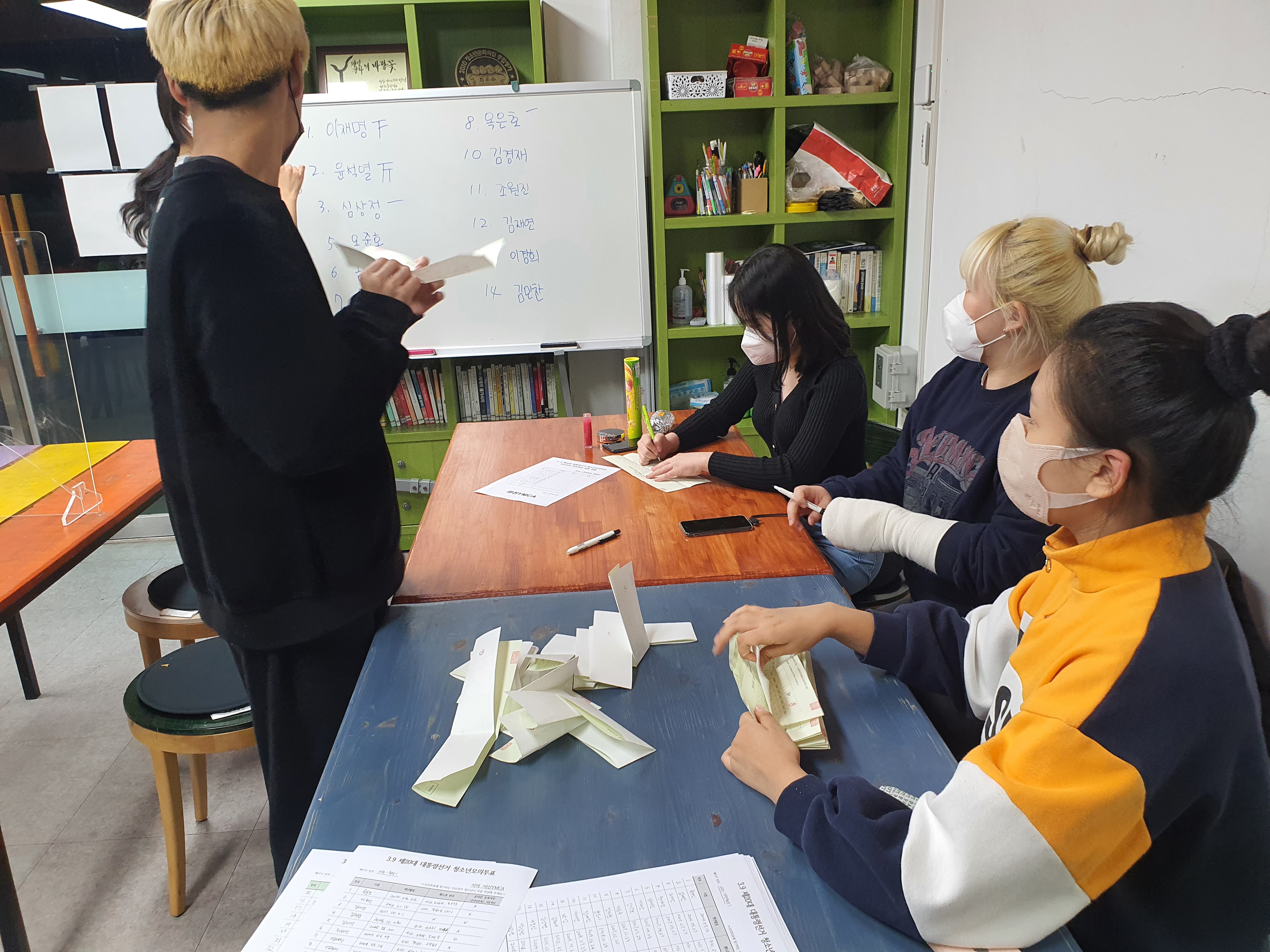 모의투표가 끝나고 월영광장과 위카페다온의 투표용지를 받아 청소년회원들과 함께 개표를 진행하였습니다. 개표를 하면서 '오오옹!' '내가 이걸 해보다니' 라는 반응들이 나오며 즐겁게 개표를 진행하였습니다! 개표 이후에도 선거인단 등록 인원수와 용지번호, 투표용지 수를 꼼꼼하게 2차례 검수하였고, 마산지역의 결과를 포함한 청소년모의투표 결과가 나왔습니다.
