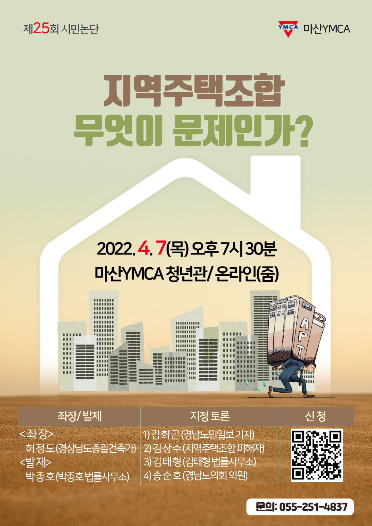 지역주택조합 무엇이 문제인지 전문가와 피해 사례를 통해 전하고자 합니다. - 일시: 2022년 4월 7일(목) 오후 7시 30분 - 장소: 마산YMCA 청년관 / 온라인(줌)