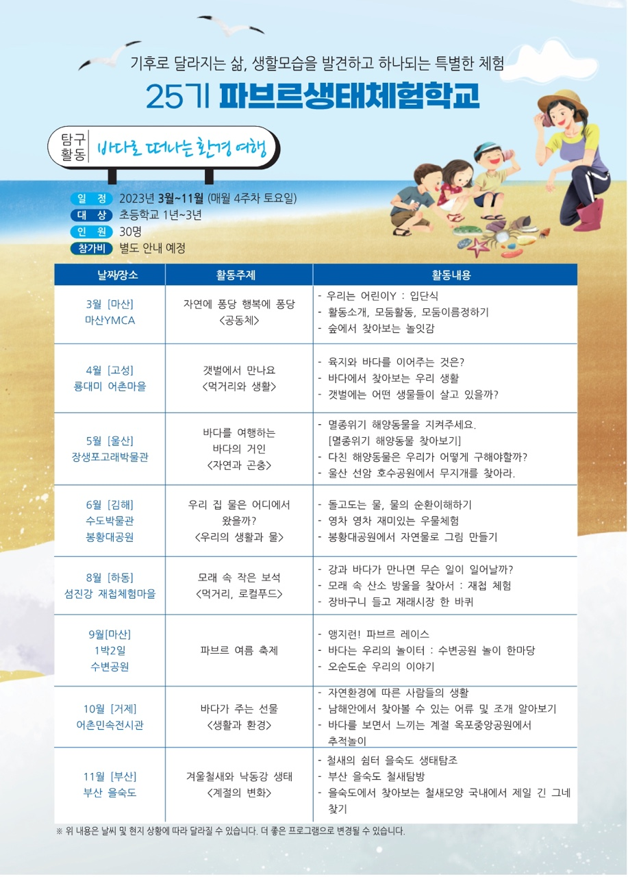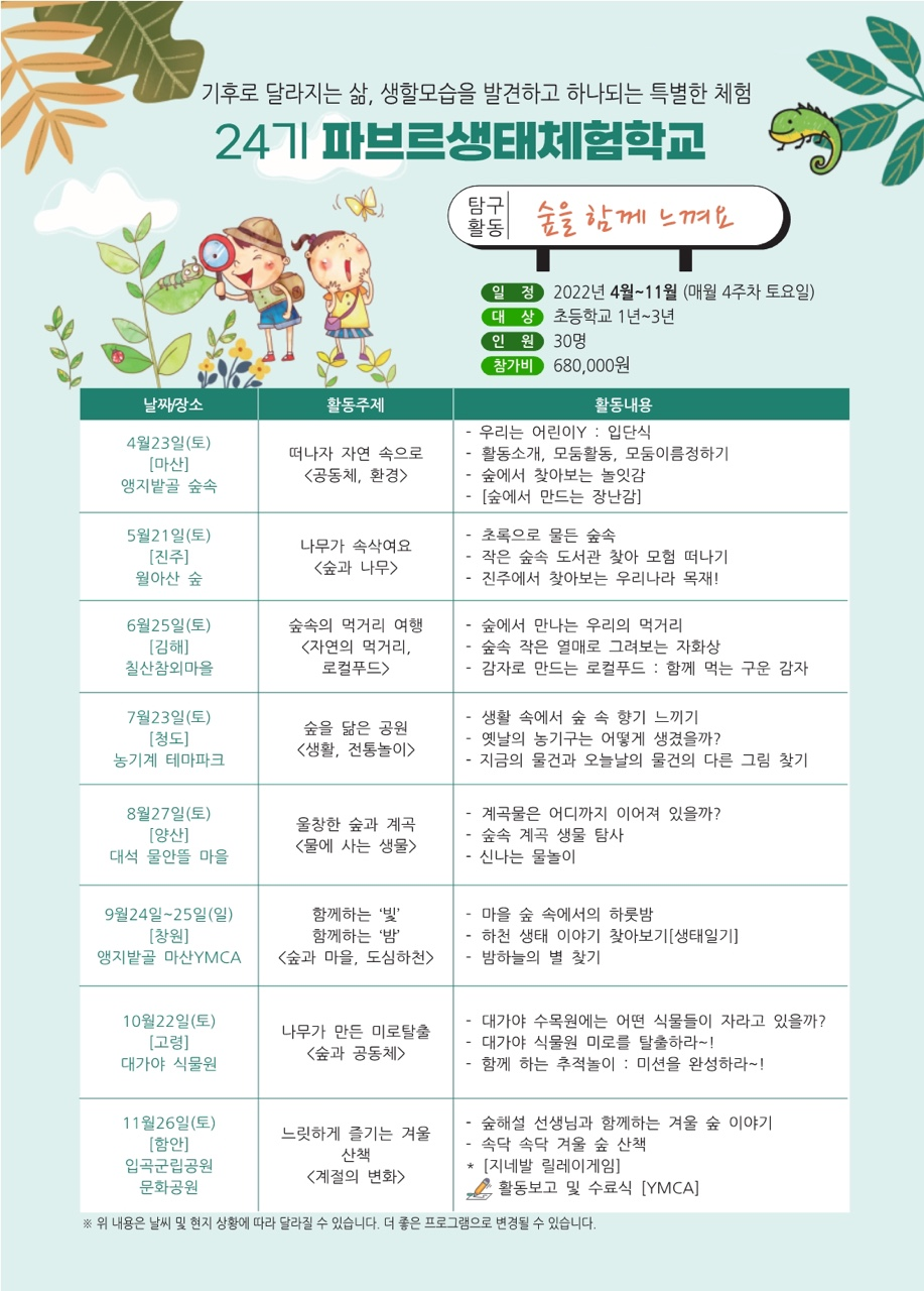 파브르생태체험학교는 넷째주 토요일 초등1학년~3학년 야외 활동으로 진행됩니다.