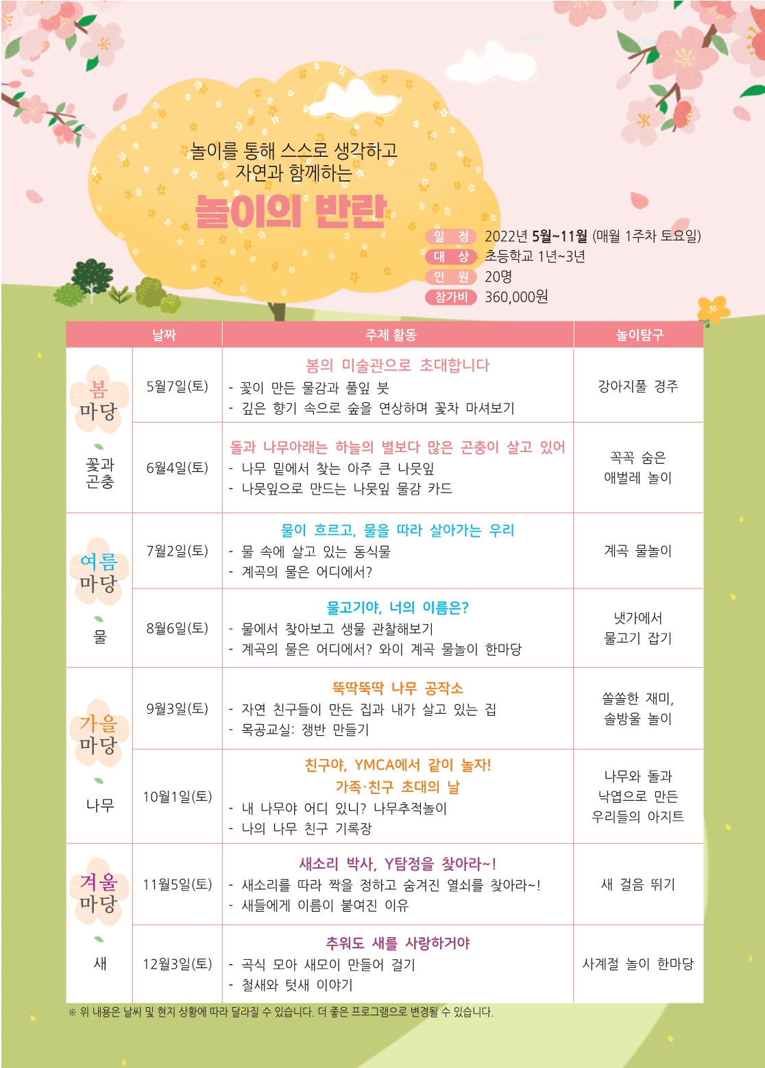 2022년에도 어린이 , 청소년 친구들과 함께 할 시간들을 생각하면서 재미있고 다양한 프로그램들을 준비 하였습니다. 다양한 경험과 활동을 통해 1년의 시간 동안 아이들이 한 발자국 더 성장 할 수 있도록 알찬 주말들을 만들겠습니다.