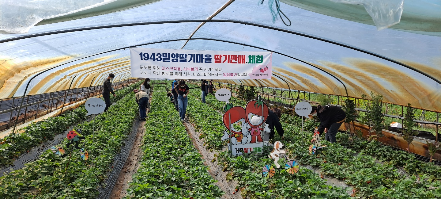 1943 밀양 딸기마을에 도착하여 딸기 수확 방법 안내받은 후 직접 체험을 해보았습니다.