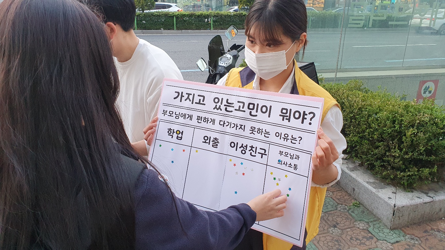 4월 한 달 동안 매주 금요일 저녁 6시 30분부터 8시까지 진행하였습니다. 간단하지만 균형 있는 먹거리와 청소년들이 힘들 때 위로받을 수 있는 마음 처방전, 청소년들이 가지고 있는 고민이 무엇인지 알 수 있는 고민 게시판을 들고 거리로 나갔습니다.