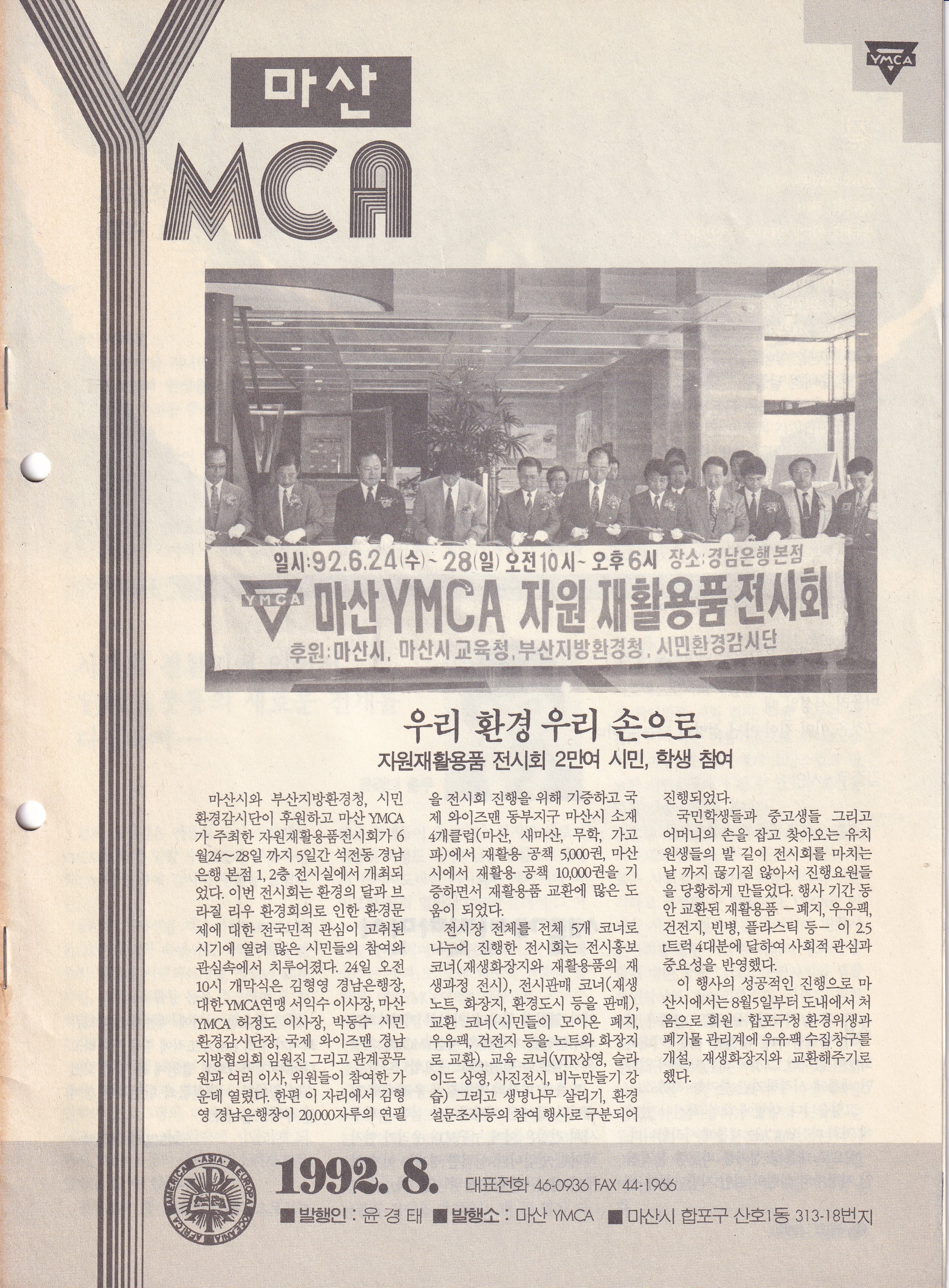 1992년 마산YMCA 자원재활용품전시회는 재활용과 분리수거가 지방자치단체의 정책으로 자리잡도록 하였을 뿐만 아니라 시민의식을 개혁하는 중요한 계기가 되었습니다.