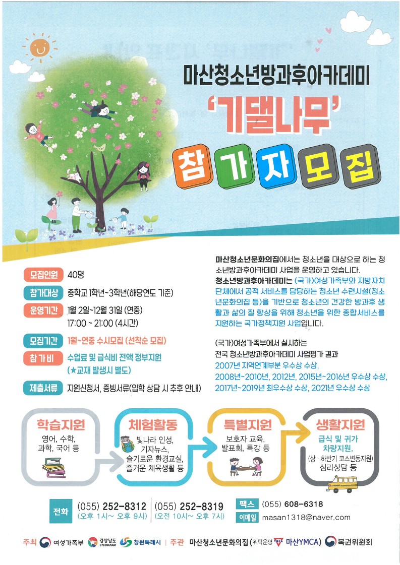 마산청소년방과후아카데미 '기댈나무' 참가자를 모집합니다. 중1학년부터 중3학년 청소년들을 대상으로 운영하고 있으며, 청소년들의 건강한 방과후 생활과 삶의 질 향상을 위해 종합서비스를 지원합니다 : )