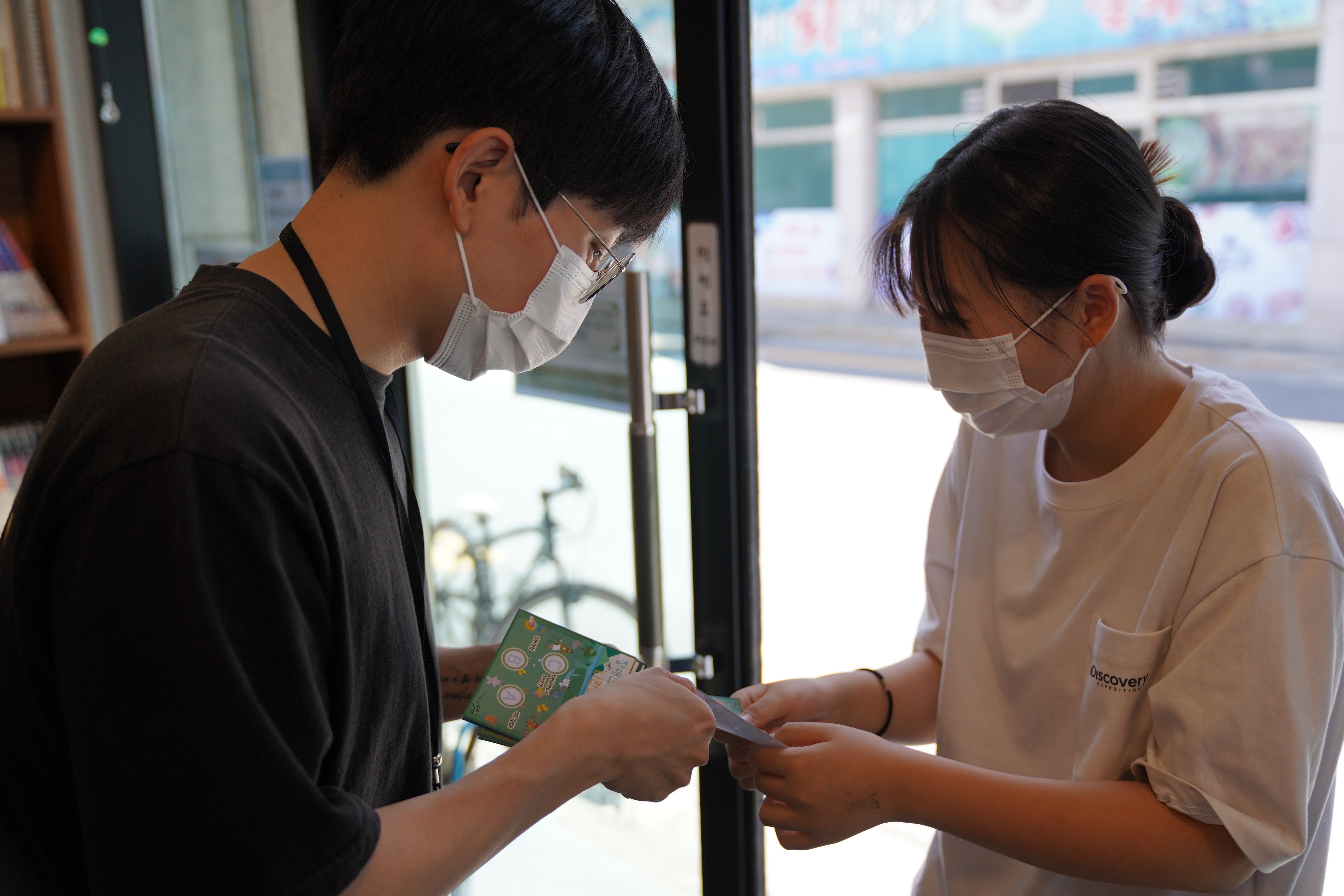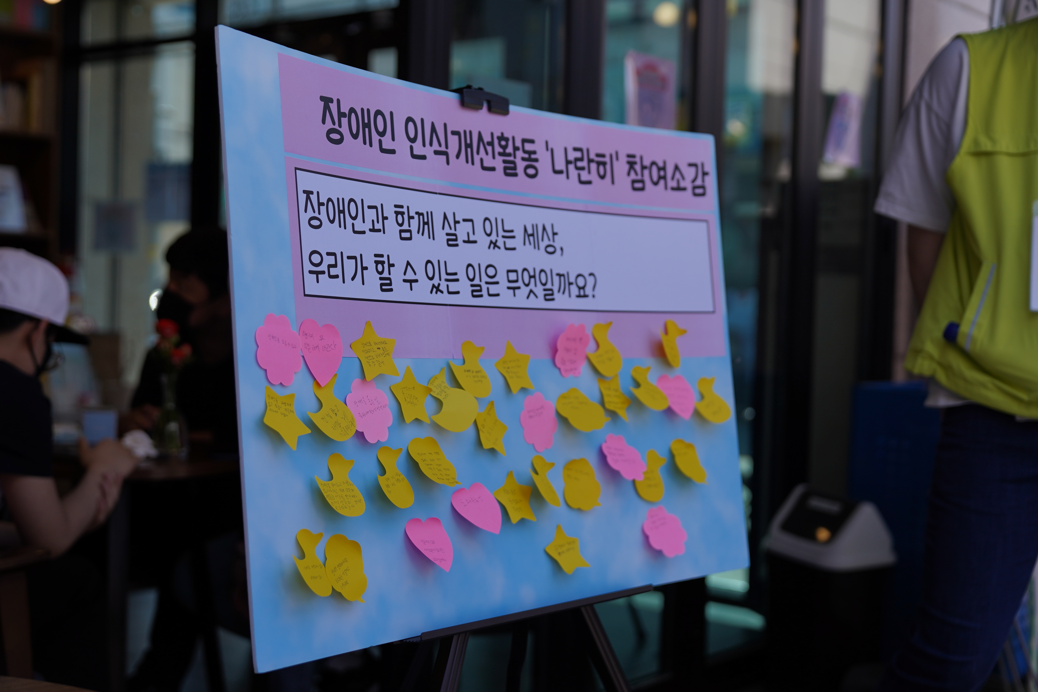 [나란히] 활동은 스탬프 투어 형식으로 진행이 되어 청소년들이 각 부스를 돌아다니며 활동을 한 후 스탬프를 다 모으면 장애인분들이 직접 만드신 굿즈와 맛있는 급식을 선물로 주었습니다.