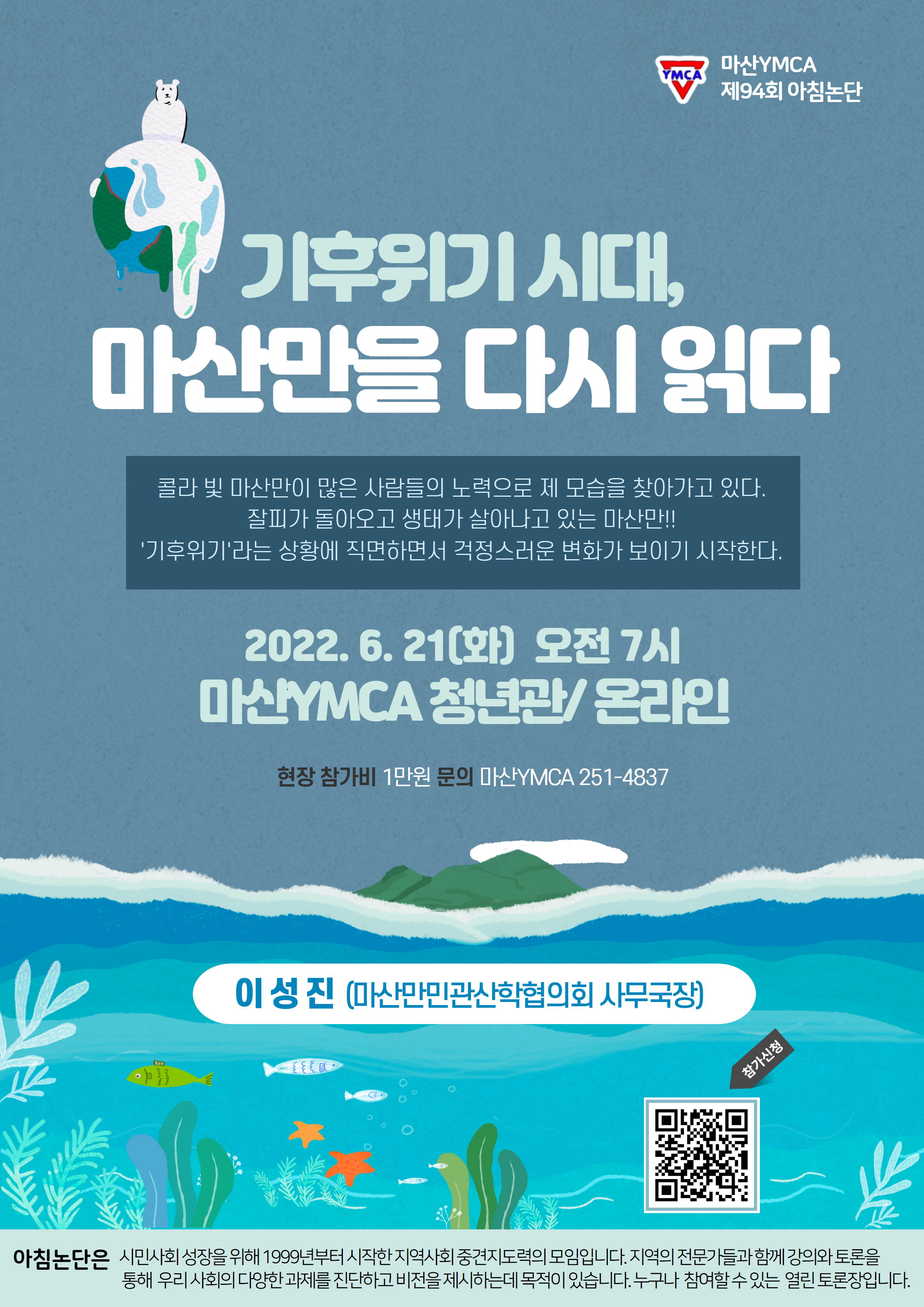 6월 21일(화) 오전 7시 제94회 아침논단이 개최됩니다. 주제는 기후위기 해양생태의 변화를 주목하여 '기후위기 시대, 마산만을 다시 읽다' 입니다. 강사는 마산만 민관산학협의회 이성진 사무국장이 맡습니다.