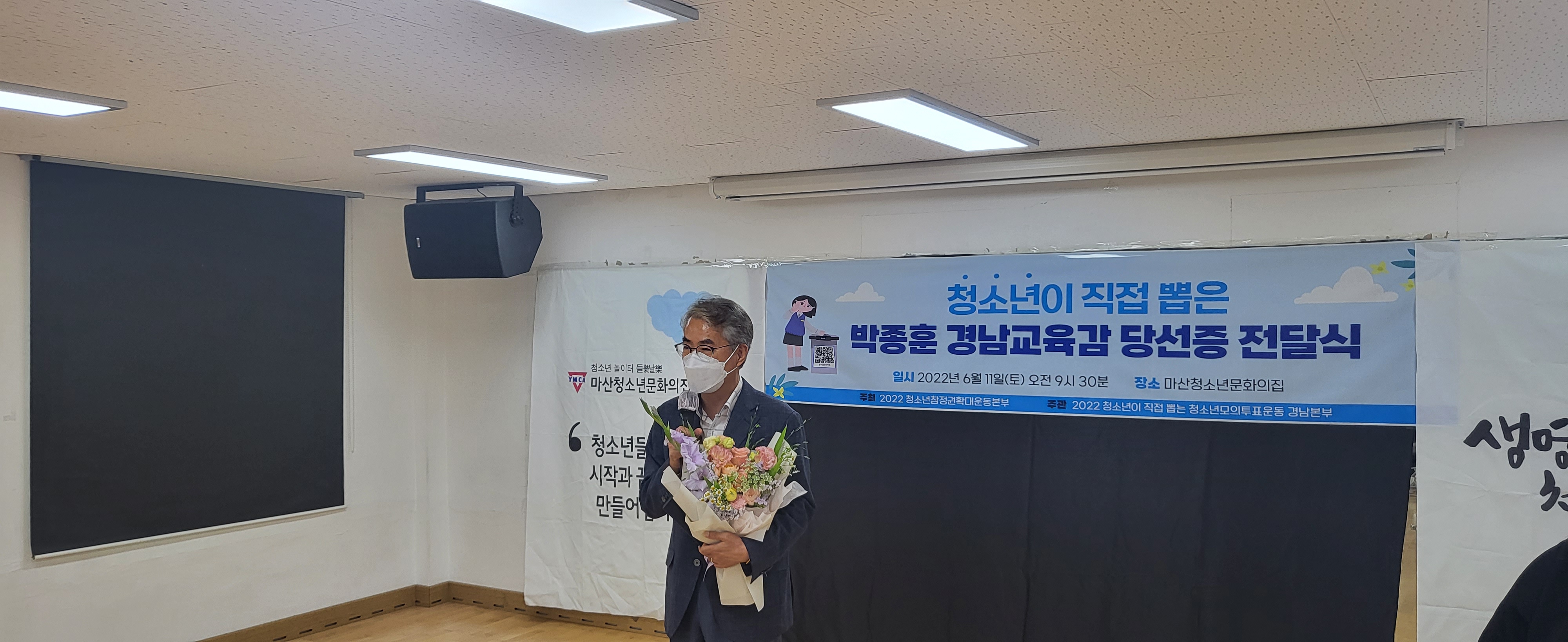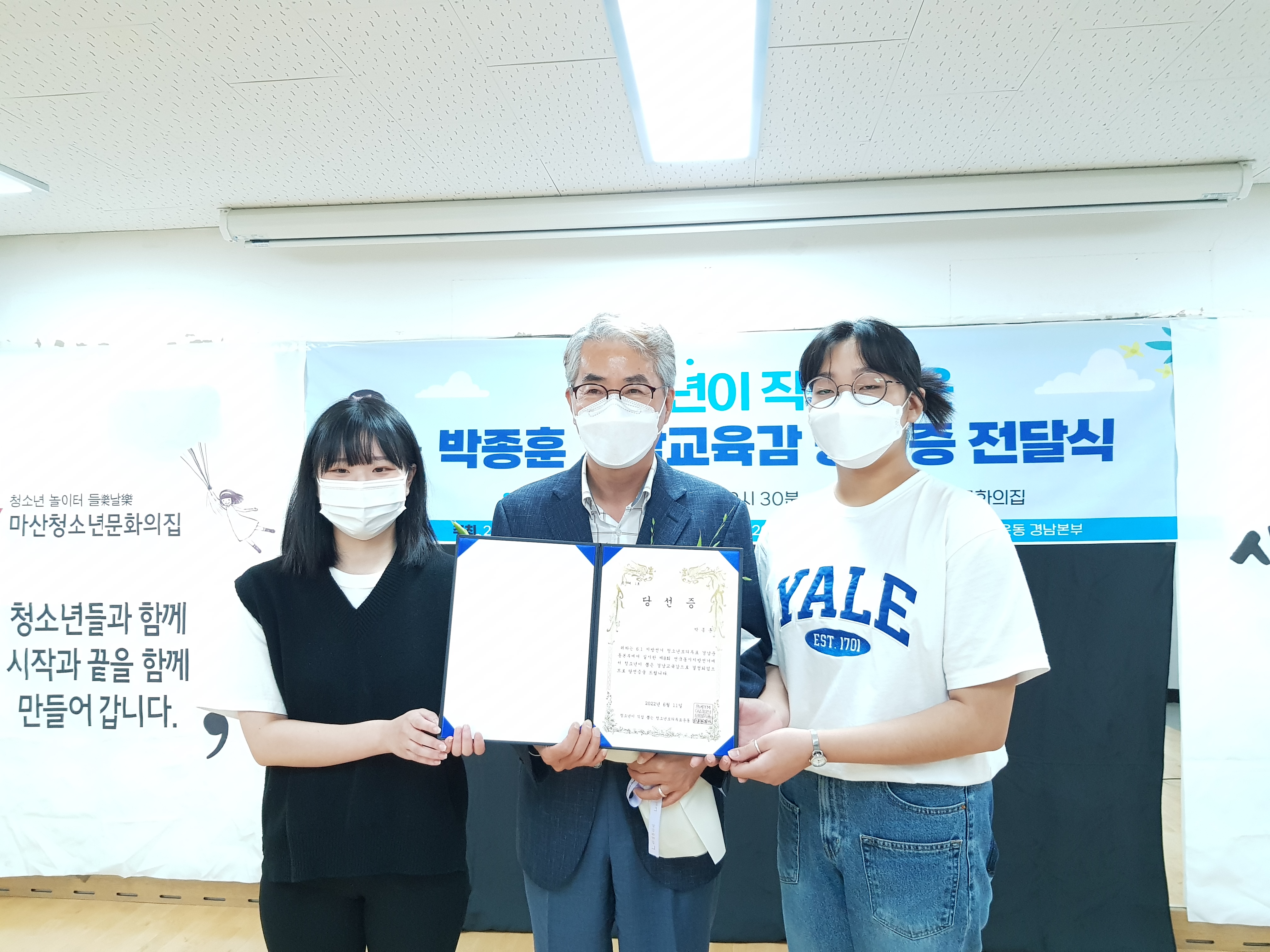 6월 11일(토) 오전 9시30분에 거창, 김해, 마산, 양산 청소년YMCA 회원들과 거창군청소년문화의집, 마산청소년문화의집 청소년들과 함께 '청소년이 뽑은 박종훈 경남교육감 당선증 전달식'을 마산청소년문화의집에서 진행하였습니다.