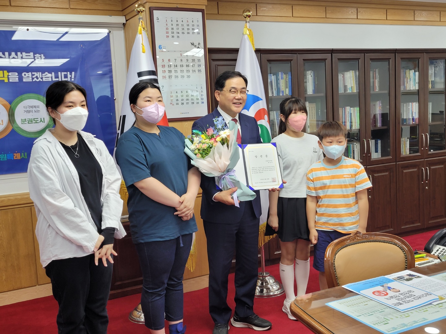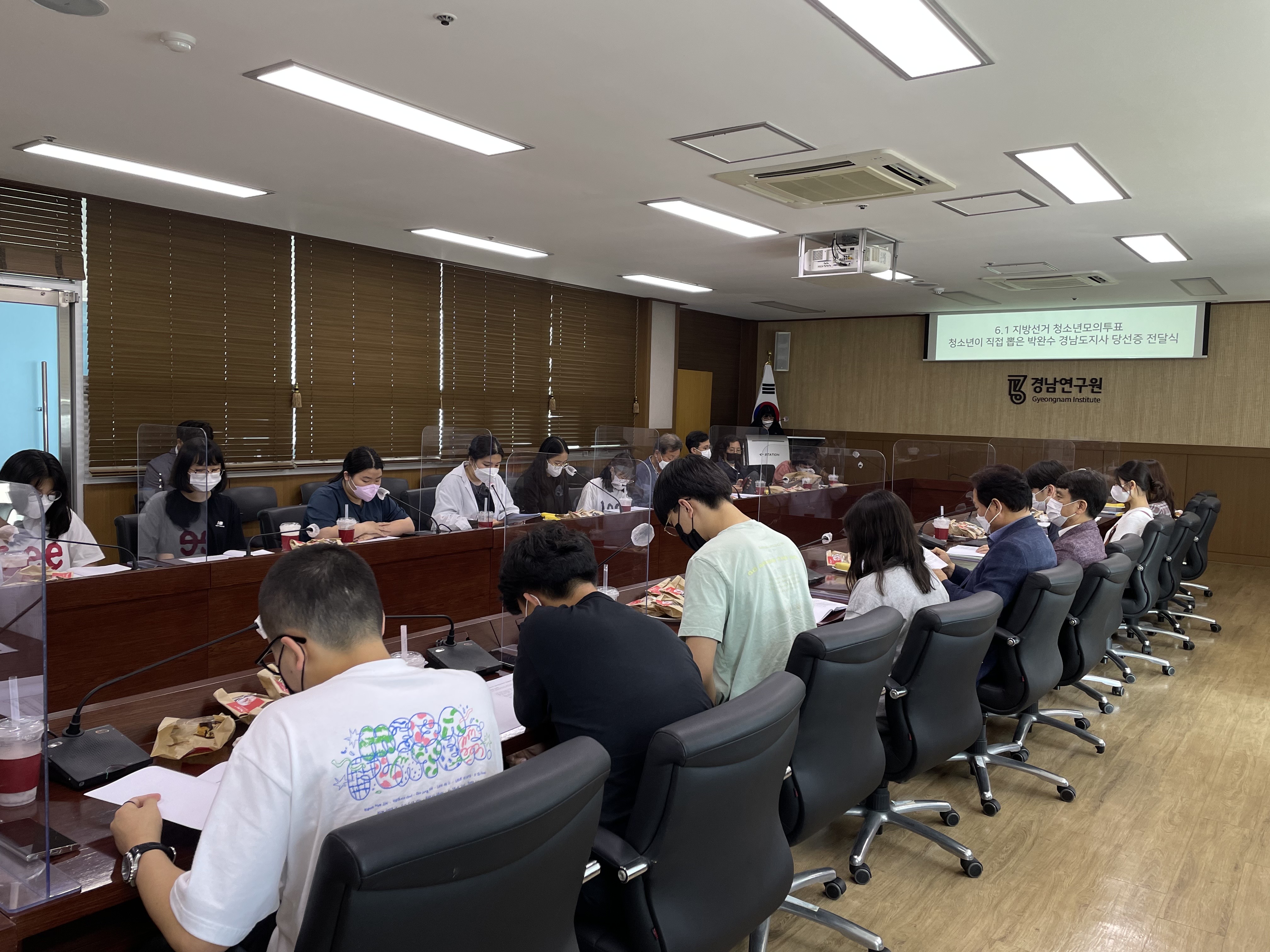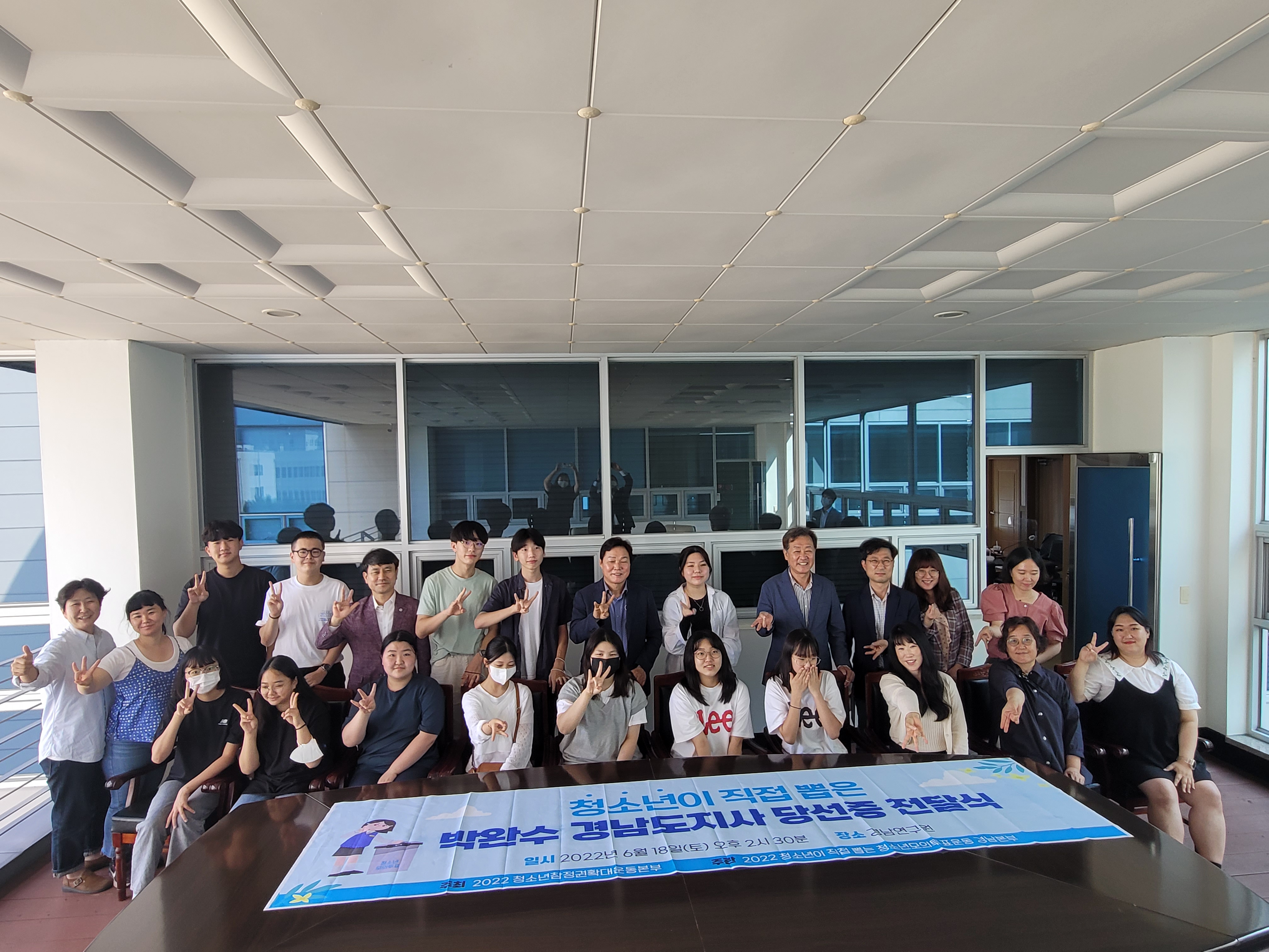 오후 2시 30분에 거창, 마산, 양산 청소년YMCA 회원들과 거창군청소년문화의집, 마산청소년문화의집 청소년들과 함께 '청소년이 뽑은 박완수 경남도지사 당선증 전달식'을 경남연구원에서 진행하였습니다.